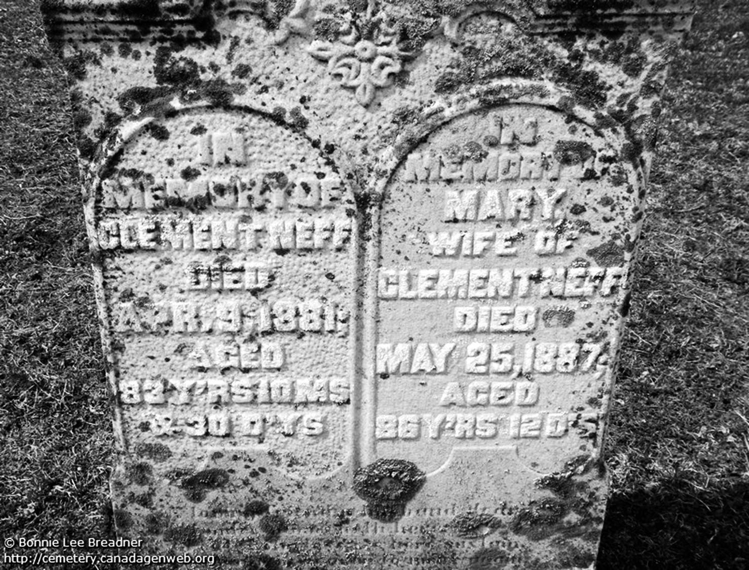 Clement Edmund Neff: Born February 18, 1832, in Haldimand, Northumberland Co., Upper Canada; Died February 14, 1925, in Medicine Hat, Alberta, Canada (age 92). Buried in Trinity United Church Cemetery, Collingwood, Simcoe Co., Ontario, Canada.