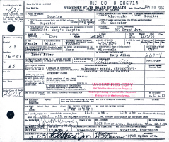 Cora Mae (Abbey) LeClair died December 5, 1955, at St. Mary's Hospital, Superior, Douglas Co., WI, at age 79. Buried in Greenwood Cemetery, Superior, Douglas Co., WI.