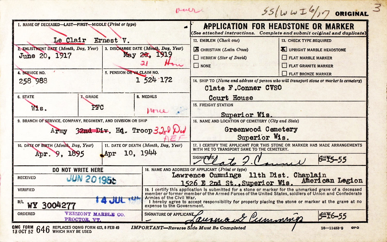 Ernest Victor LeClair died April 10, 1944, at Veterans Administration National Home for Disabled Soldiers, 23rd Ward, City of Milwaukee, Milwaukee Co., WI, at age 49. Buried in Greenwood Cemetery, Superior, Douglas Co., WI.