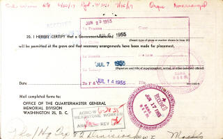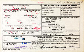 - Ernest Victor LeClair: Born April 9, 1895, in Rhinelander, Oneida Co., WI; Died April 10, 1944, at Veterans Administration National Home for Disabled Soldiers, 23rd Ward, City of Milwaukee, Milwaukee Co., WI (age 49). Buried in Greenwood Cemetery, Superior, Douglas Co., WI. His Veteran Service Number is: 258 988. Married June 23, 1936, in Gaslyn, Town of Rusk, Burnett Co., WI, to Jane Ruth Miller: Born June 9, 1911, in Burnett Co., WI; Died November 11, 1991, at Morton Plant Hospital, Clearwater, Pinellas Co., FL (age 90). Cremated. Divorced before 1940 in Wisconsin. Jane Ruth (Miller) LeClair then Married (2) July 6, 1943, at the First Methodist Church, Madison, Dane Co., WI, to Edward Milton Brockett: Born March 30, 1914, in Enfield, White Co., IL; Died October 6, 1982, in Clearwater, Pinellas Co., FL (age 68). Cremated.