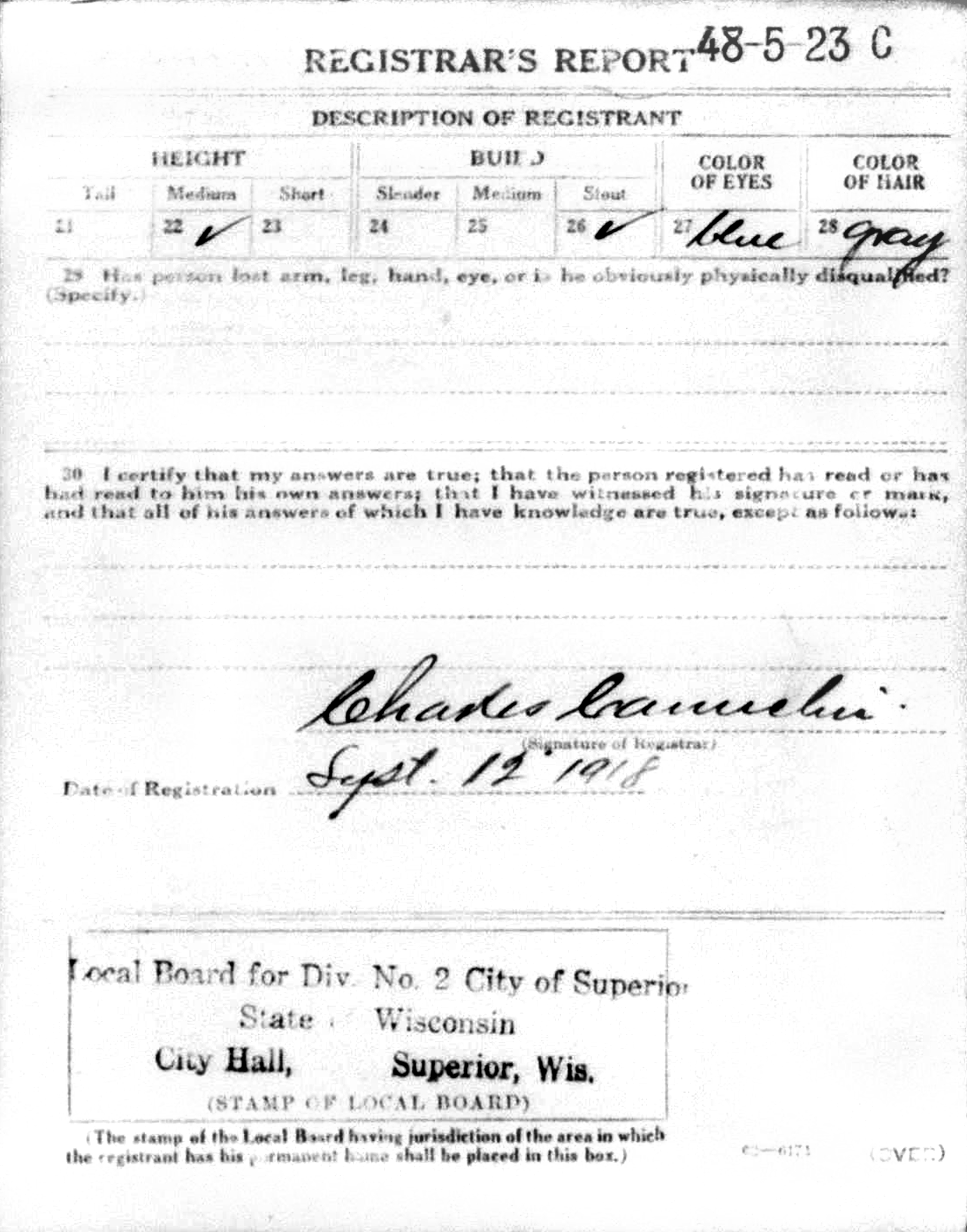 The WWI Draft Registration Report dated September 12, 1918, shows Frank Joseph LeClair (age 45) born June 20, 1873, is unmarried and is living at 165 Main Street, Superior, Douglas Co., WI. He has Short Height, Medium Build, Blue Eyes and Dark Hair.