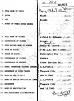 Cora Ethyl Olivia (Johnson) Johnson died November 22, 1970, at Riverside Community Memorial Hospital, Waupaca, Waupaca Co., WI, at age 70. Buried in West Akers Cemetery, Ridgeland, Dunn Co., WI.