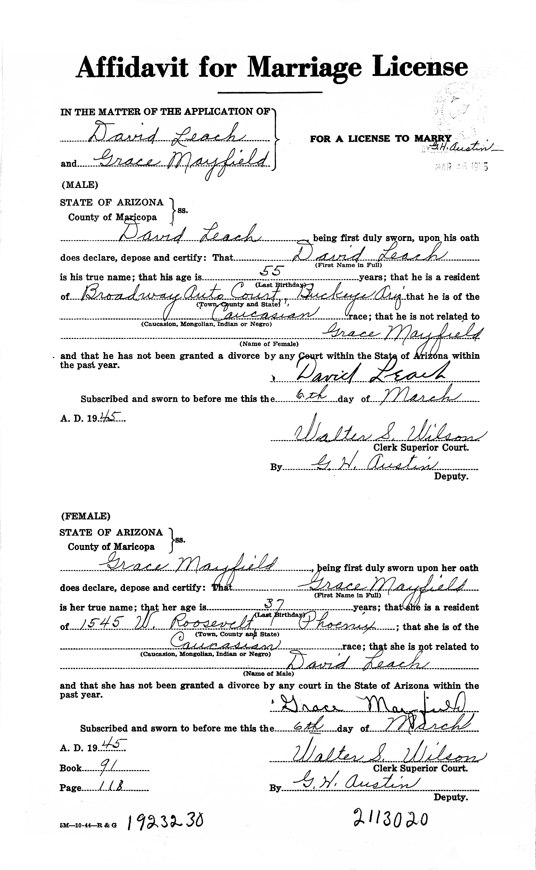 Mayfield (age 37), a divorcee, were married March 6, 1945, in Phoenix, Maricopa Co., AZ.