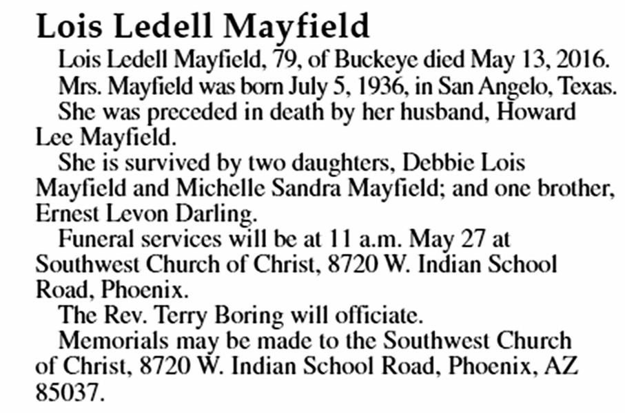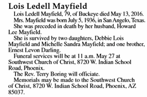 Mayfield died May 13, 2016, in Maricopa Co., AZ, at age 79. Buried in Louis B.