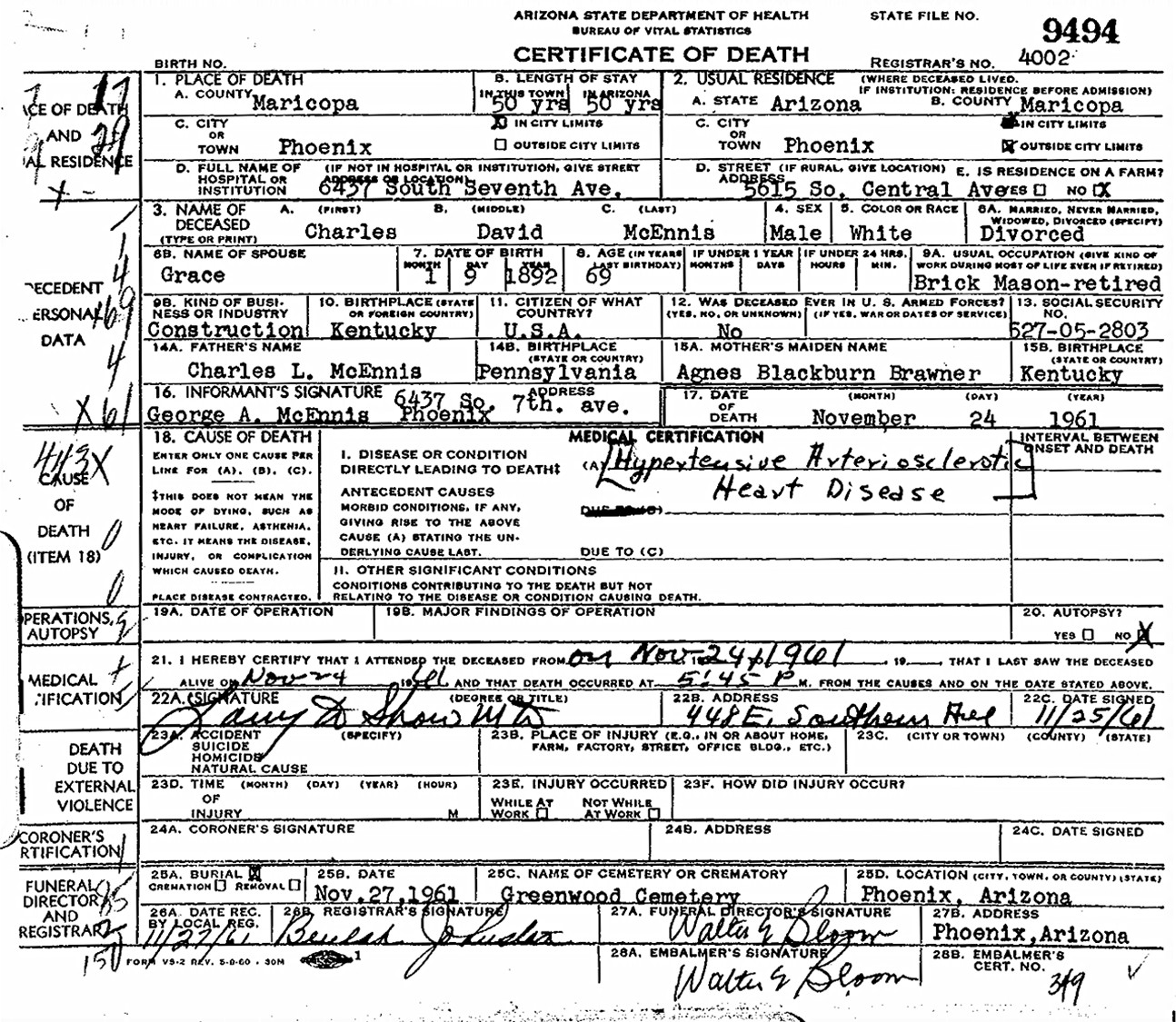 in Paducah, McCracken Co., KY, and died May 18, 1952, at St. Joseph's Hospital, Phoenix, Maricopa Co.,