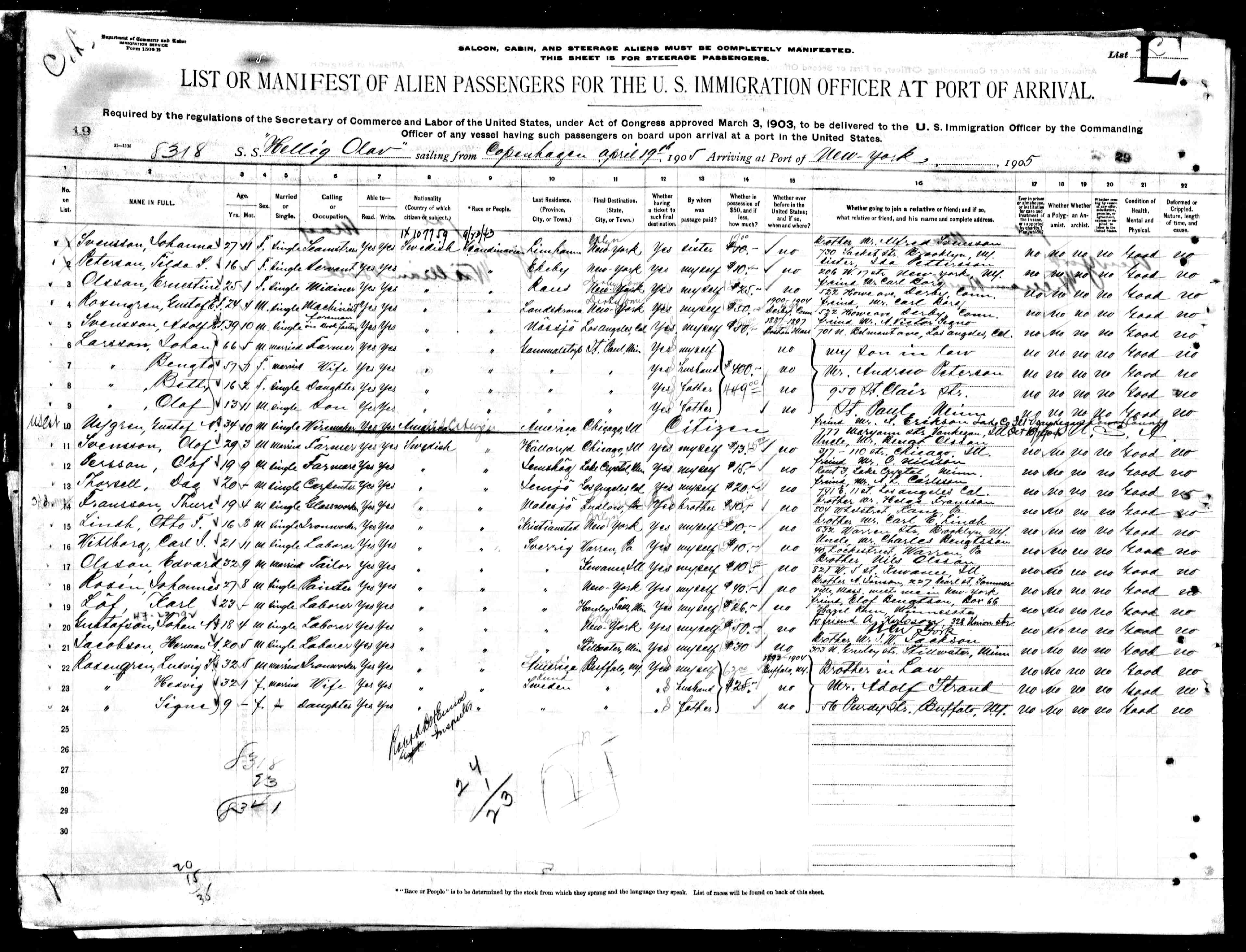 (age 29), a Swedish Citizen, from Kalmar, Kalmar lan, Sweden, arrived at the Port of New York aboard the