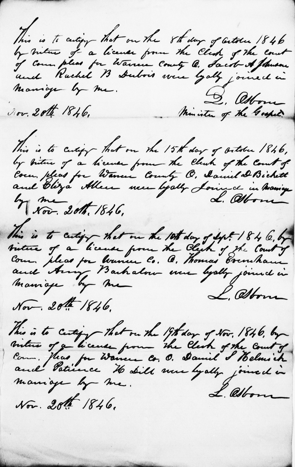 Daniel Dean Bickett Sr. (about age 22) and Eliza Ellen Allen (age 23) were married October 9, 1846, in Lebanon, Warren Co., OH.