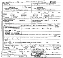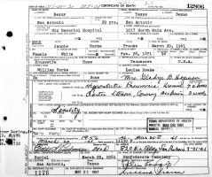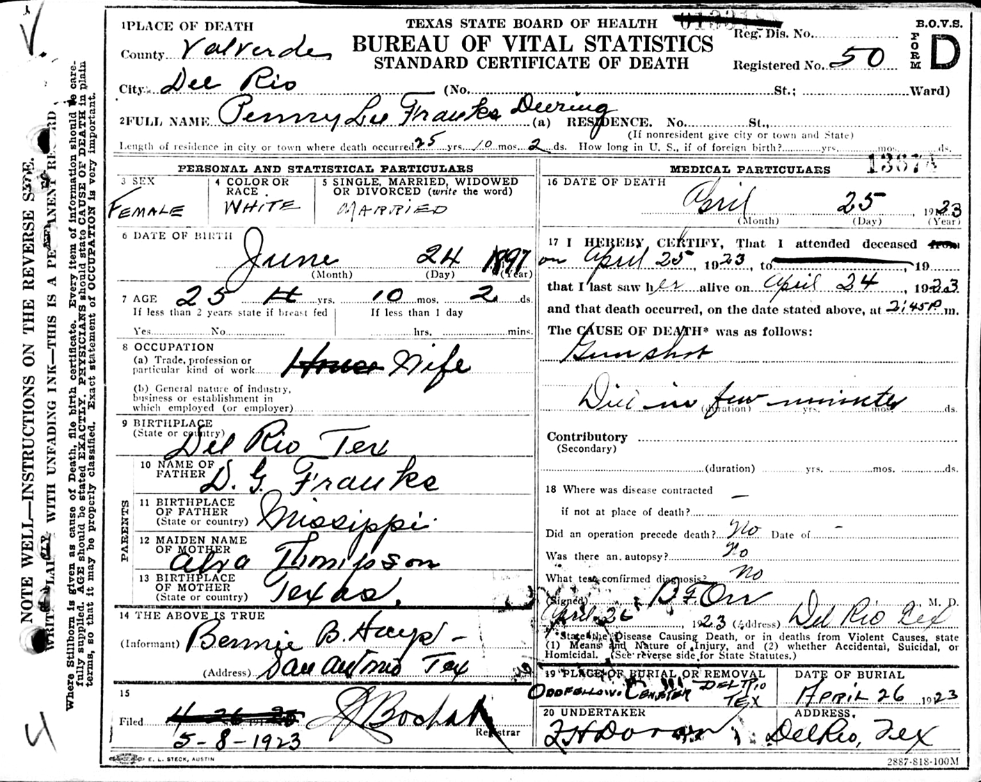 - Penelope Lee "Penny" Franks: Born June 24, 1897, in Eagle Pass, Maverick Co., TX; Died April 25, 1923, at the Franks Hotel, Del Rio, Val Verde Co., TX (age 25). Buried in Westlawn Cemetery, Del Rio, Val Verde Co., TX. Penny died from a gunshot. Married about 1921 in Texas to Sidney Mitchell Deering: Born January 17, 1898, in Calwell Twp., Fannin Co., GA; Died April 25, 1923, at the Franks Hotel, Del Rio, Val Verde Co., TX (age 25). He was a second class radio operator, and a graduate of Harvard University.