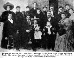 Daddy Franks called us all together and said, "Children, we are a big family and I hope a happy one. There is room and welcome for each and every one of you. I want it distinctly understood that there sits the boss" - he pointed to mother - "and I insist that you all respect and obey her. As long as you do, this is your home, but to the first one who breaks that rule - there is the door leading out." That rule stood and the only one who ever got the door was his own son, Alonzo. I can't remember what it was about.