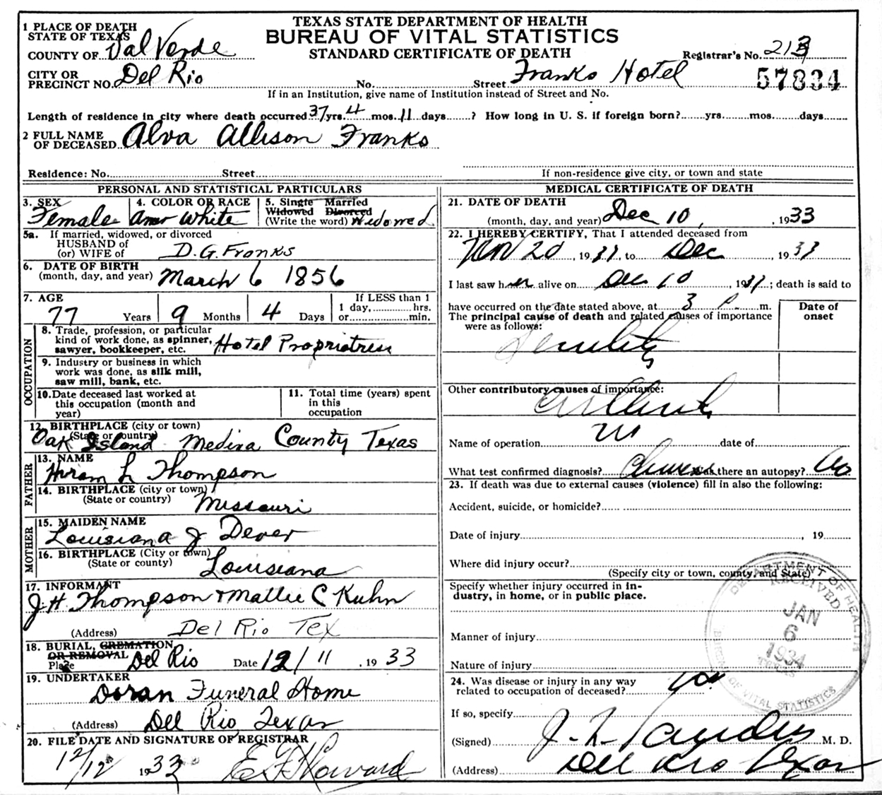 Alva Allison Thompson was born March 6, 1856, in Oak Island, located on the Medina River in Bexar Co., TX, and died December 10, 1933, at her home at the Franks Hotel, Del Rio, Val Verde Co., TX, at age 77. Buried in Westlawn Cemetery, Del Rio, Val Verde Co., TX. She is the daughter of Hiram Lowe Thompson of Gasconade, Gasconade Co., MO, and Louisiana Jackson (Dever) Yocum of Metairie, Jefferson Parish, LA. Primary Cause of Death: Senility.