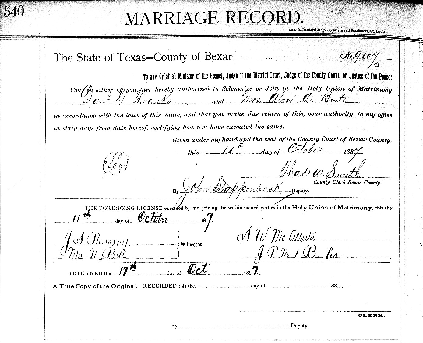 Daniel Gandy "Dan" Franks and Alva Allison (Thompson) Brite were married October 11, 1887, in Bexar Co., TX.