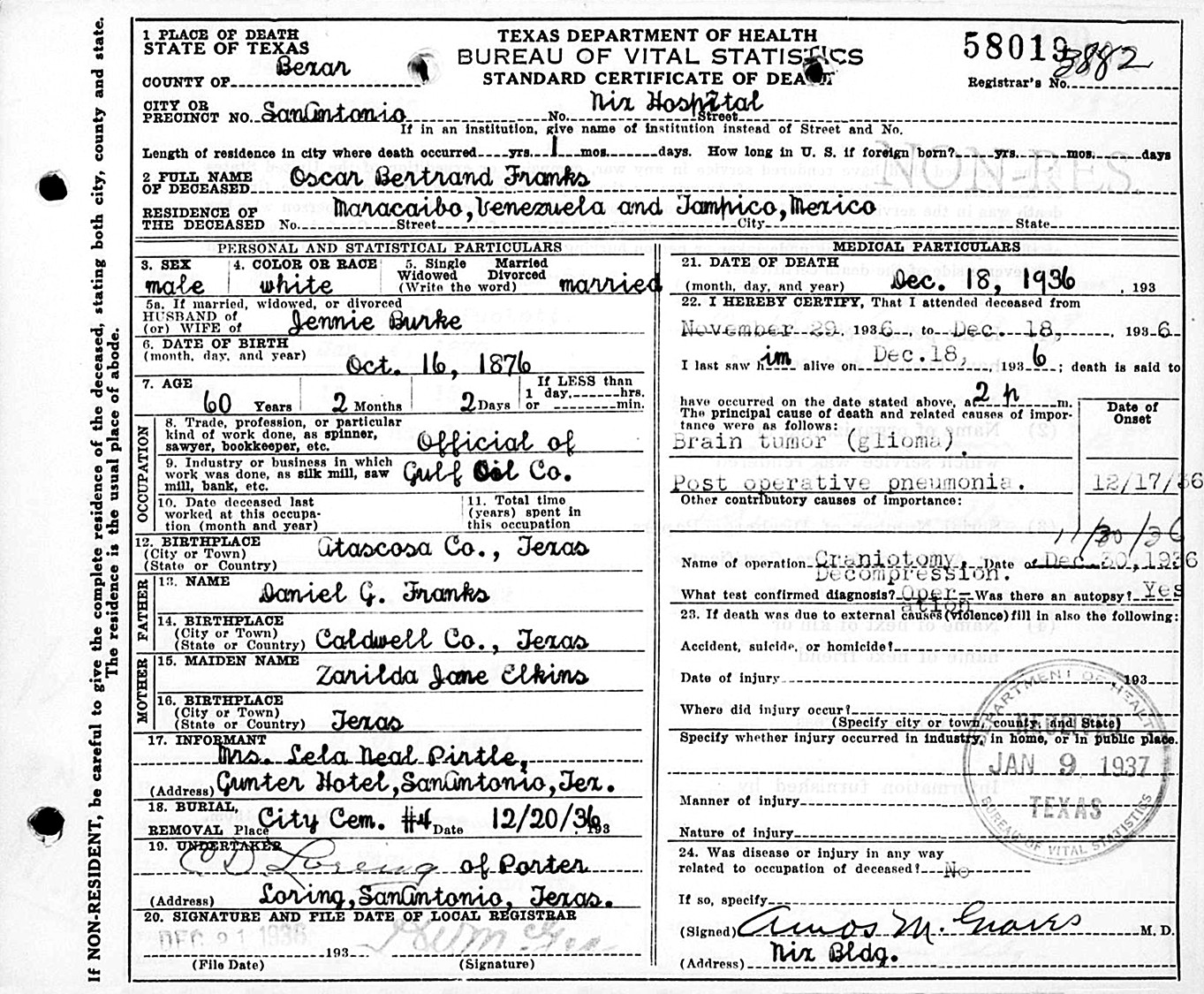 - Oscar Bertrand Franks: Born October 16, 1876, in Pleasanton, Atascosa Co., TX; Died December 18, 1936, at Nix Hospital, San Antonio, Bexar Co., TX (age 60). Buried in City Cemetery #4, San Antonio, Bexar Co., TX. Married June 15, 1898, in Bexar Co., TX, to Jenine L. "Jennie" Burke: Born February 28, 1871, in Goodlettsville, Sumner or Davidson Co., TN; Died March 20, 1961, in Nix Memorial Hospital, San Antonio, Bexar Co., TX (age 90). Buried in Confederate Cemetery, San Antonio, Bexar Co., TX.