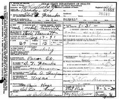 - Robert Ingersoll "Polk/Bob" Franks: Born August 17, 1891, in Dryden, Pecos Co., TX; Died August 31, 1930, in a Brady hospital, Brady, McCulloch Co., TX (age 39). Buried in Westlawn Cemetery, Del Rio, Val Verde Co., TX. Married (1) April 11, 1911, in Val Verde Co., TX, to Miss Grace Earle Williams: Born Unknown; Died Unknown. Married (2) March 27, 1917, in Del Rio, Val Verde Co., TX, to Dovey Lucille Barnett: Born March 27, 1897, in Llano, Midland Co., TX; Died March 28, 1972, in Navasota, Grimes Co., TX (age 75). Buried in Oakland Cemetery, Navasota, Grimes Co., TX. Dovey then married Unknown Brown: Born Unknown; Died Unknown. Separated or divorced. Dovey's parents are James Barnett and Rachel Wallace. Child: Bennie Lou Franks. Married Howard Binford Weaver: Born March 25, 1928, in Grimes Co., TX. Bennie is buried in Oakland Cemetery, Navasota, Grimes Co., TX.