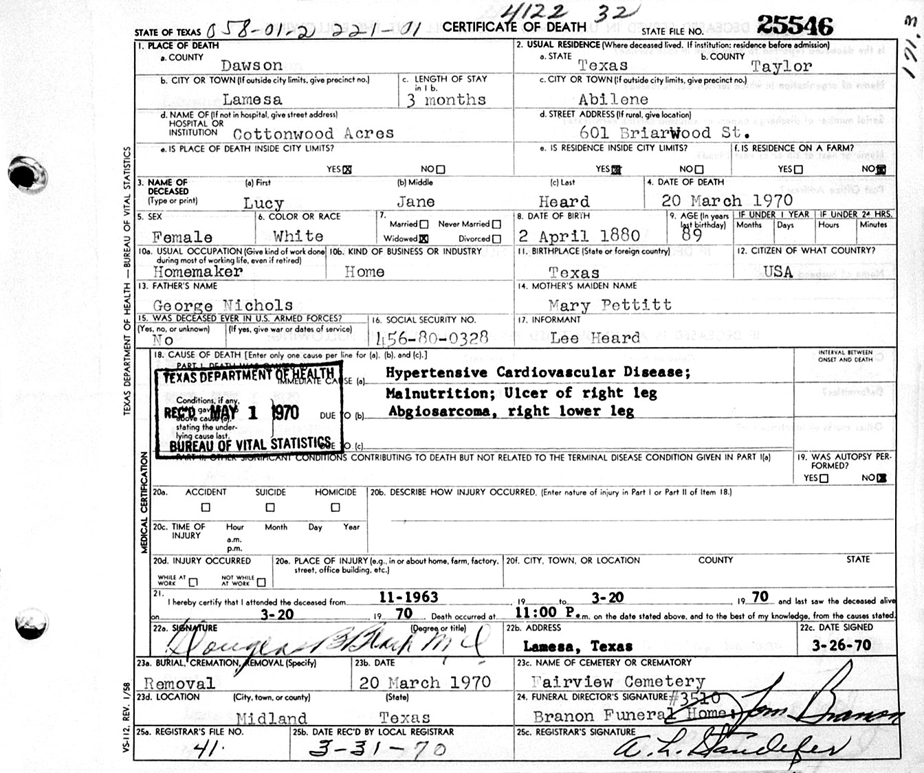 - Lela Franks: Born 1874 in Atascosa Co., TX; Died about 1894 in Midland Co., TX (about age 25). Married November 3, 1890, in Pecos Co., TX, to Lee Foster Heard: Born October 10, 1864, in De Witt Co., TX; Died August 3, 1942, in Midland, Midland Co., TX (age 77). Lee Foster Heard then married June 25, 1902, in Midland, Midland Co., TX, to Lucy Jane Nichols: Born April 2, 1880, in Comfort, TX; Died March 20, 1970, at Cottonwood Acres Nursing Home, City of Lamesa, Dawson Co., TX (age 89). Buried in Fairview Cemetery, Midland, Midland Co., TX.
