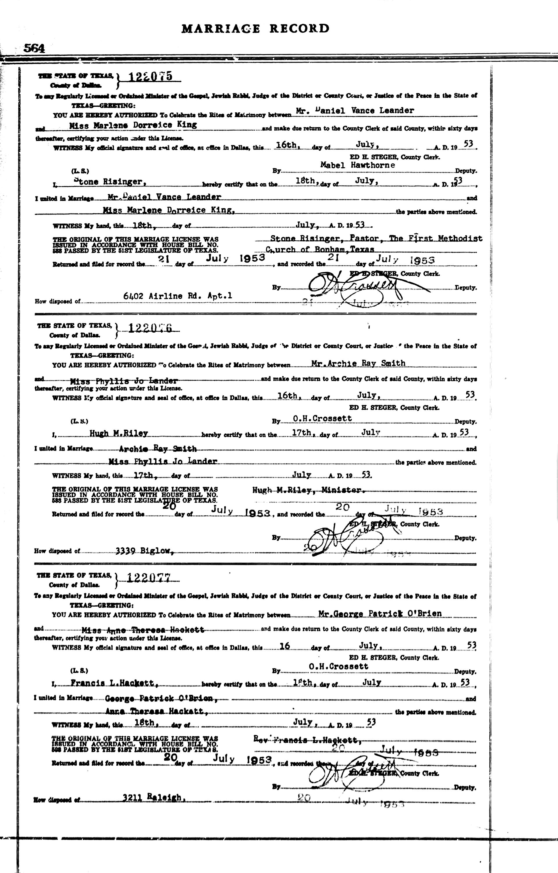 Daniel Vance Leander and Marlene Dorreice King were married July 18, 1953, in Bonham, Dallas Co., TX.