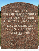 - Isabella Geddes: Born about October, 1867, in Morris Twp., Huron Co., Ontario, Canada; Died December 18, 1892, in East Wawanosh Twp., Huron Co., Ontario, Canada (age 24). Buried in Brandon Cemetery, Belgrave, Huron Co., Ontario, Canada.