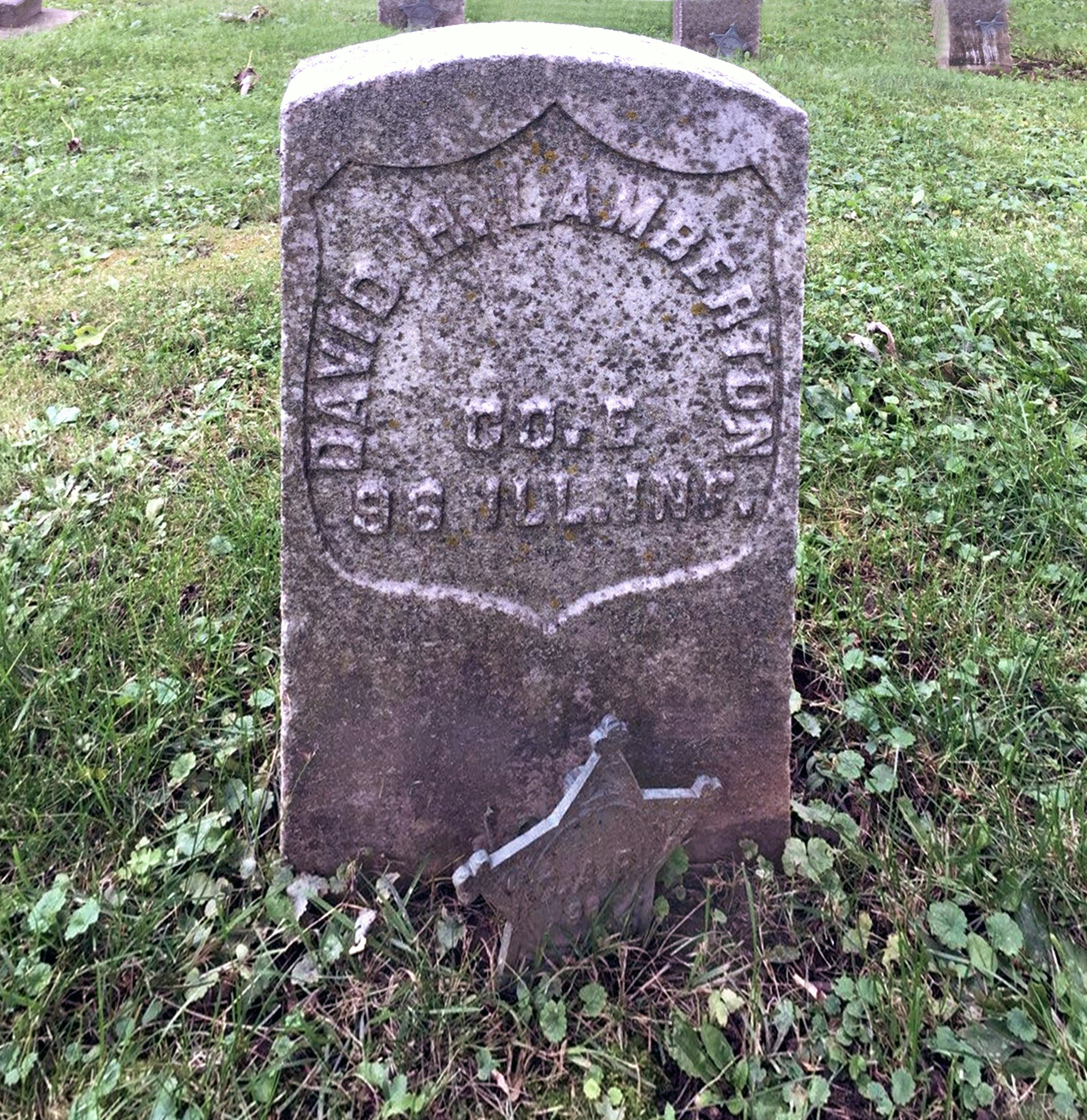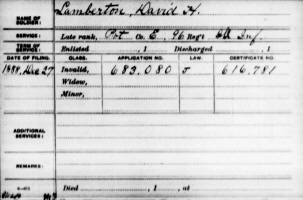 HISTORY OF THE 96th Regiment, Illinois Volunteer Infantry: David Henry Lamberton. Age 27; born in New York; Farmer; enlisted August 15, 1862, from Warren; Was living at time of enlistment in Apple River, IL. was in several engagements; Mustered Out June 10, 1865, at Nashville, TN. with Regiment. Resides at Freeport, Ill. Filed for an Invalid Pension on December 27, 1888. David H. Lamberton died November 14, 1899, in Freeport, Stephenson Co., IL, at age 60.