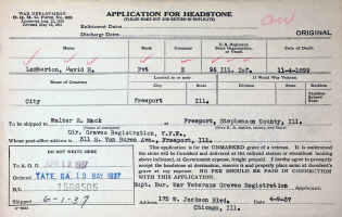David Henry Lamberton Jr. died November 14, 1899, in Freeport, Stephenson Co., IL, at age 60. Buried in Freeport City Cemetery, Freeport, Stephenson Co., IL. The gravestone was ordered from the U. S. Government in 1937 for his unmarked grave. Thanks to Billion Graves for making this image available.