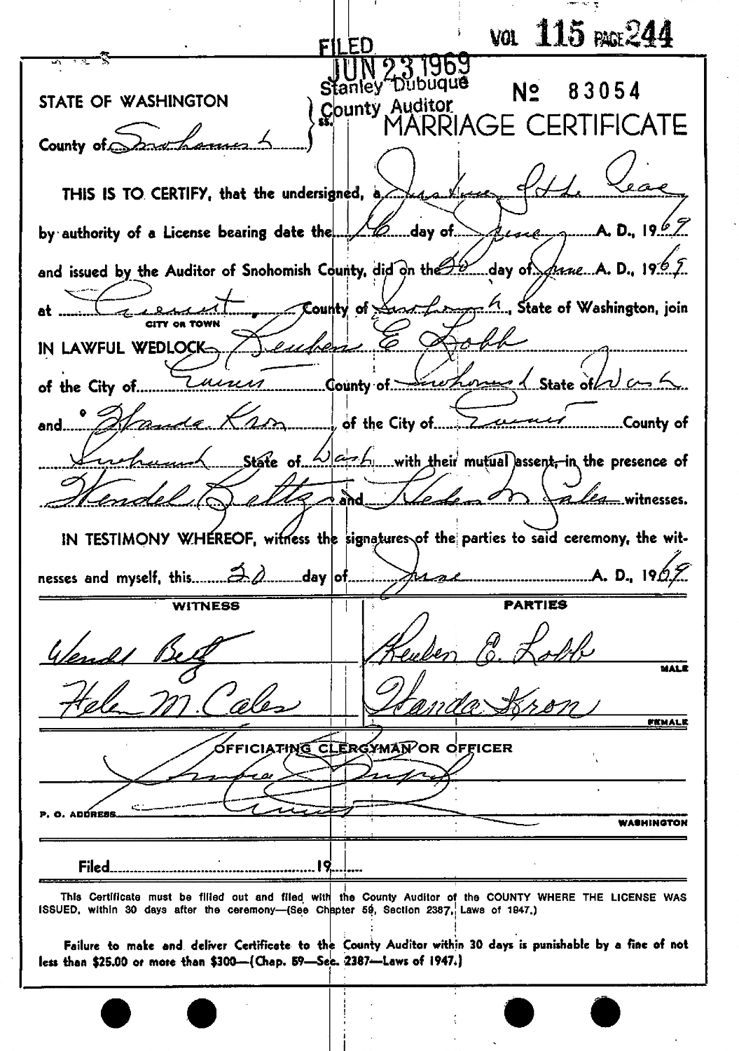 Reuben Eugene "Gene" Lobb and Wanda Elaine (Ervig) (McVay) (Brooks) Kron were married June 20, 1969, in Cuennt, Snohomish Co., WA.
