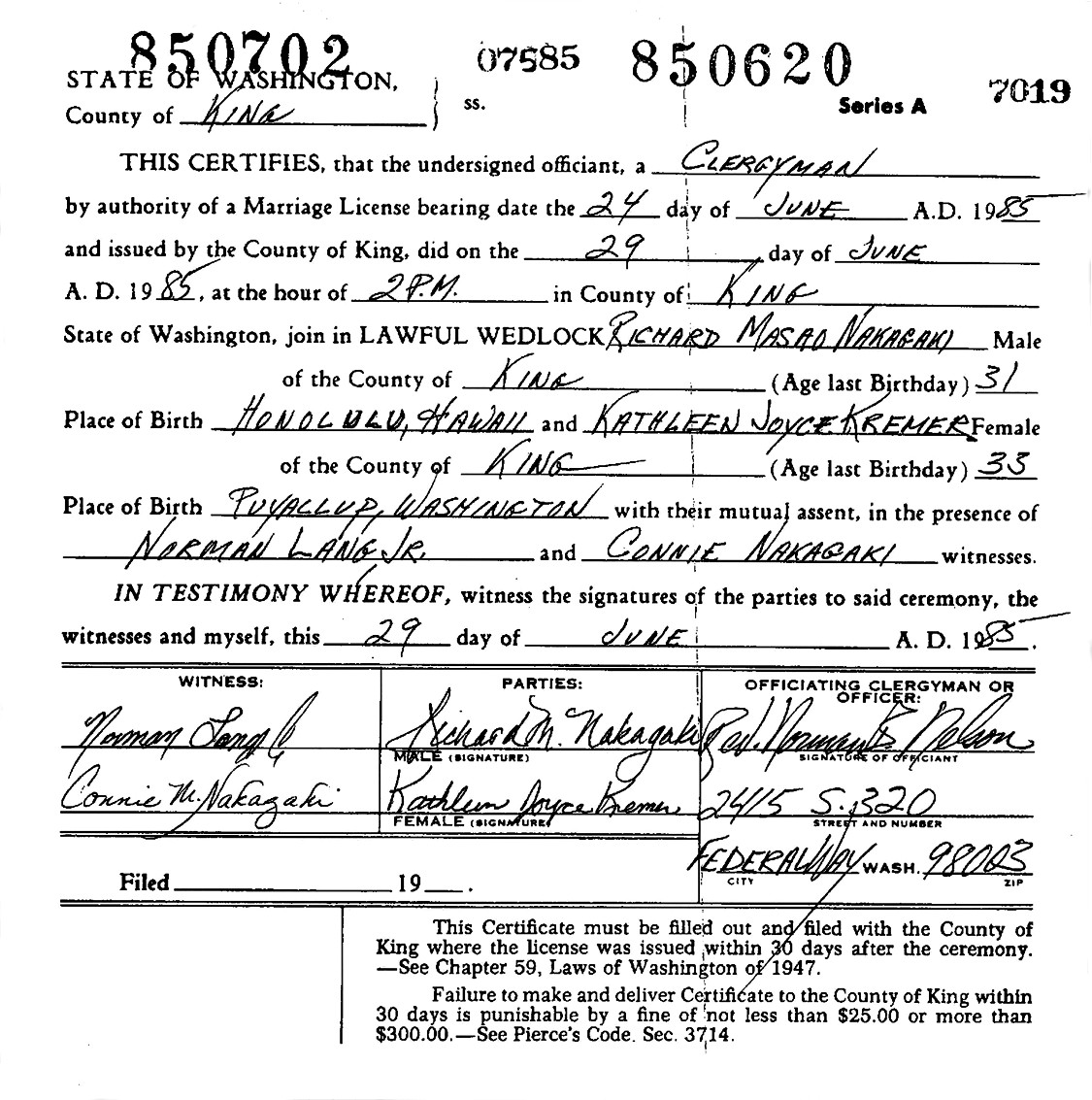 Richard Masao Nakagaki and Kathleen Joyce (Kremer) Collins were married June 29, 1985, in King Co., WA.