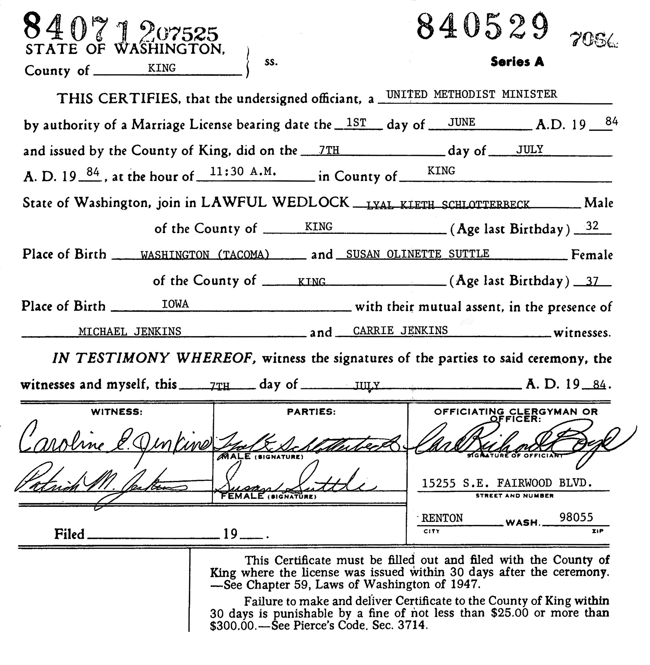 Lyal Kieth Schlotterbeck and Susan Olinette Suttle were married July 7, 1984, in Tacoma, Pierce Co., WA.
