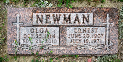 - Ernest Newman: Born June 20, 1907, in Benedict Twp., Mercer Co., ND; Died July 19, 1971, in Ward Co., ND (age 64). Buried in Velva Cemetery, Velva, McHenry Co., ND. Married March 19, 1933, in Velva, McHenry Co., MN, to Olga Marie Heggem: Born October 25, 1914, in Hillsboro, Traill Co., ND; Died November 24, 2010, at Trinity Hospital, Minot, Ward Co., ND (age 96). Buried in Velva Cemetery, Velva, McHenry Co., ND.