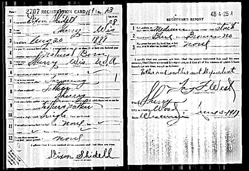 The WWI Draft Registration Report dated June 5, 1917, shows Dixon Shidell (age 28) born August 20, 1888, in Sherry, WI, is unmarried and Farming for his father.
