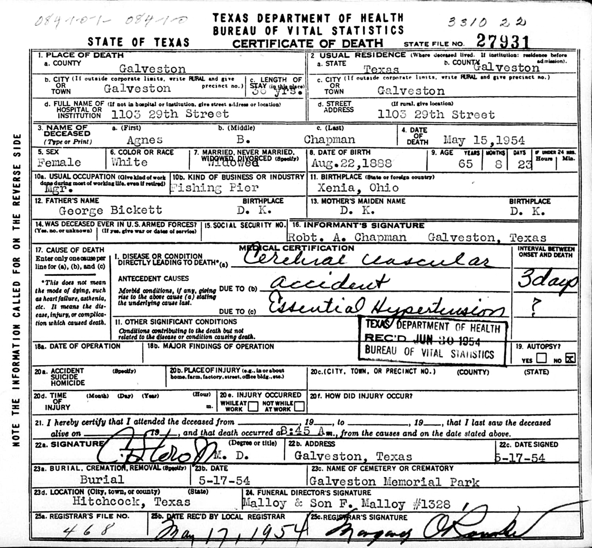 Death: Gastritis and Bronchitis. She had lived in Texas for about 30 years (about