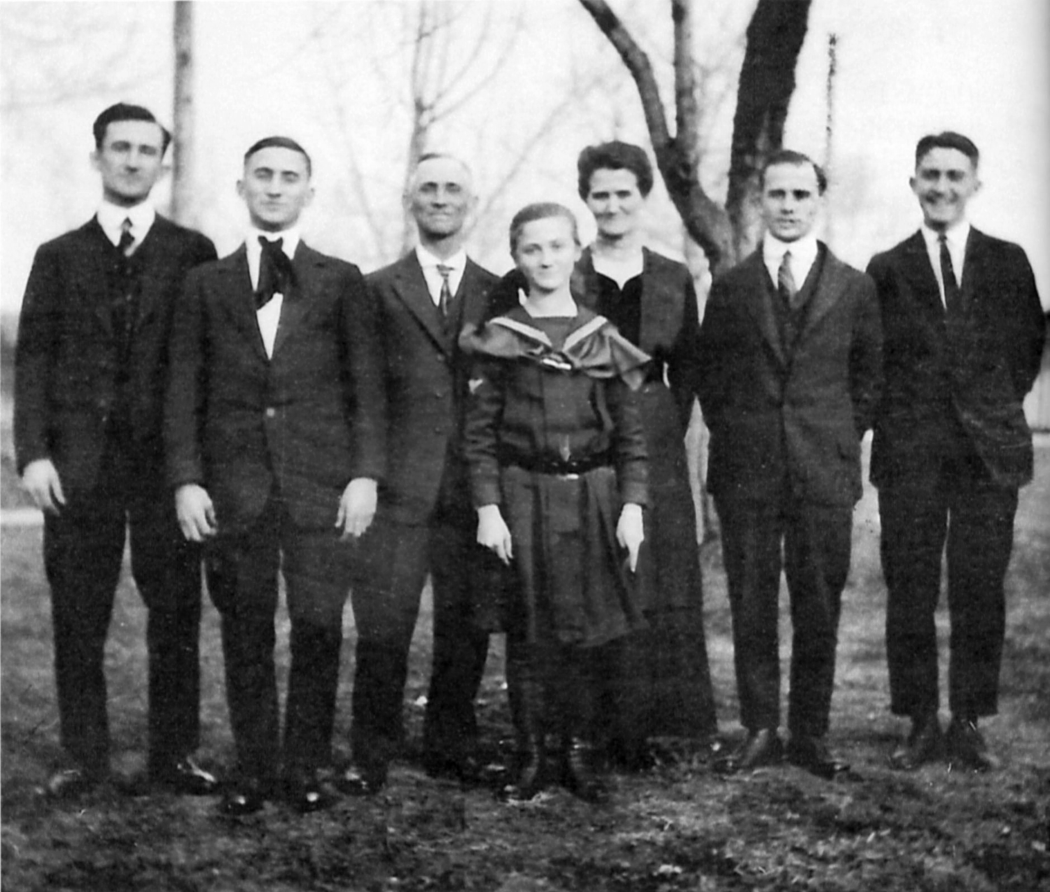 The family of Charles Herbert "Charley" Lovell and Dora Belle (Blake) Lovell, 1917, Village of Muscoda, Iowa Co., WI. Left to right: Ralph Herbert Lovell; Malcolm Harold Lovell; Charles Herbert "Charley" Lovell; Dorothy Belle Lovell; Dora Belle (Blake) Lovell; Orren Blake Lovell and Glenn Ayres Lovell.