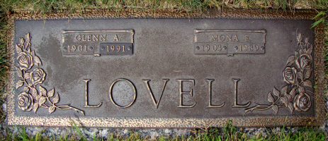 - Glenn Ayres Lovell: Born January 4, 1901, in the Town of Orion, Richland Co., WI ; Died November 24, 1991, at Silver Cross Hospital, Joliet, Will Co., IL (age 90). Buried in Chapel Hill Gardens West, Oak Brook Terrace, DuPage Co., IL. Married June 25, 1924, at the First Methodist Church, Madison, Dane Co., WI, to Mona Elizabeth "Betty" Williams: Born November 19, 1903, in Elk Grove, Lafayette Co., WI; Died September 27, 1989, at Mennonite Hospital Long Term Care, Bloomington, McLean Co., IL (age 85). Buried in Chapel Hill Gardens West, Oak Brook Terrace, DuPage Co., IL.