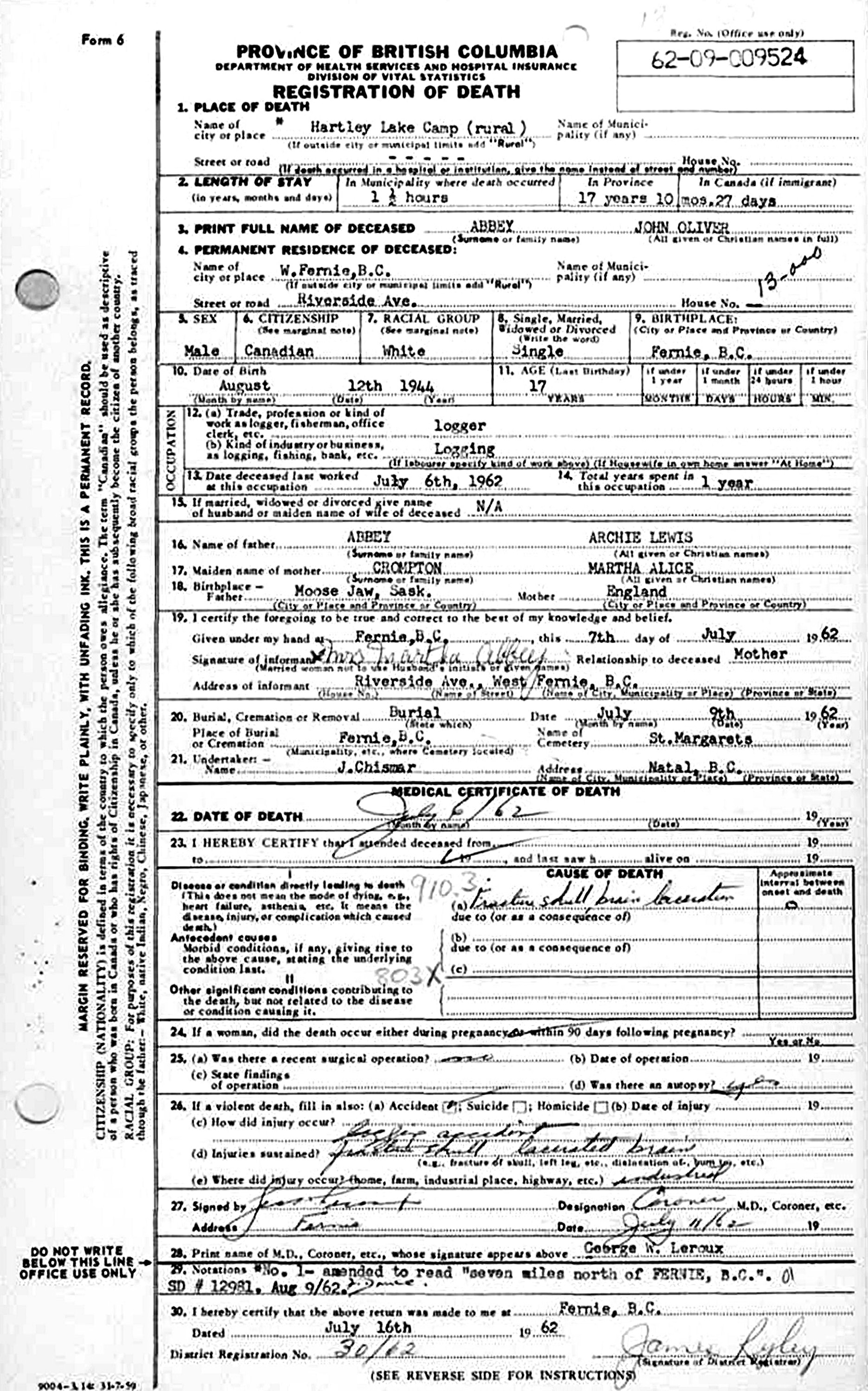 September 21, 1947, in Fernie District, British Columbia, Canada, at age 77.