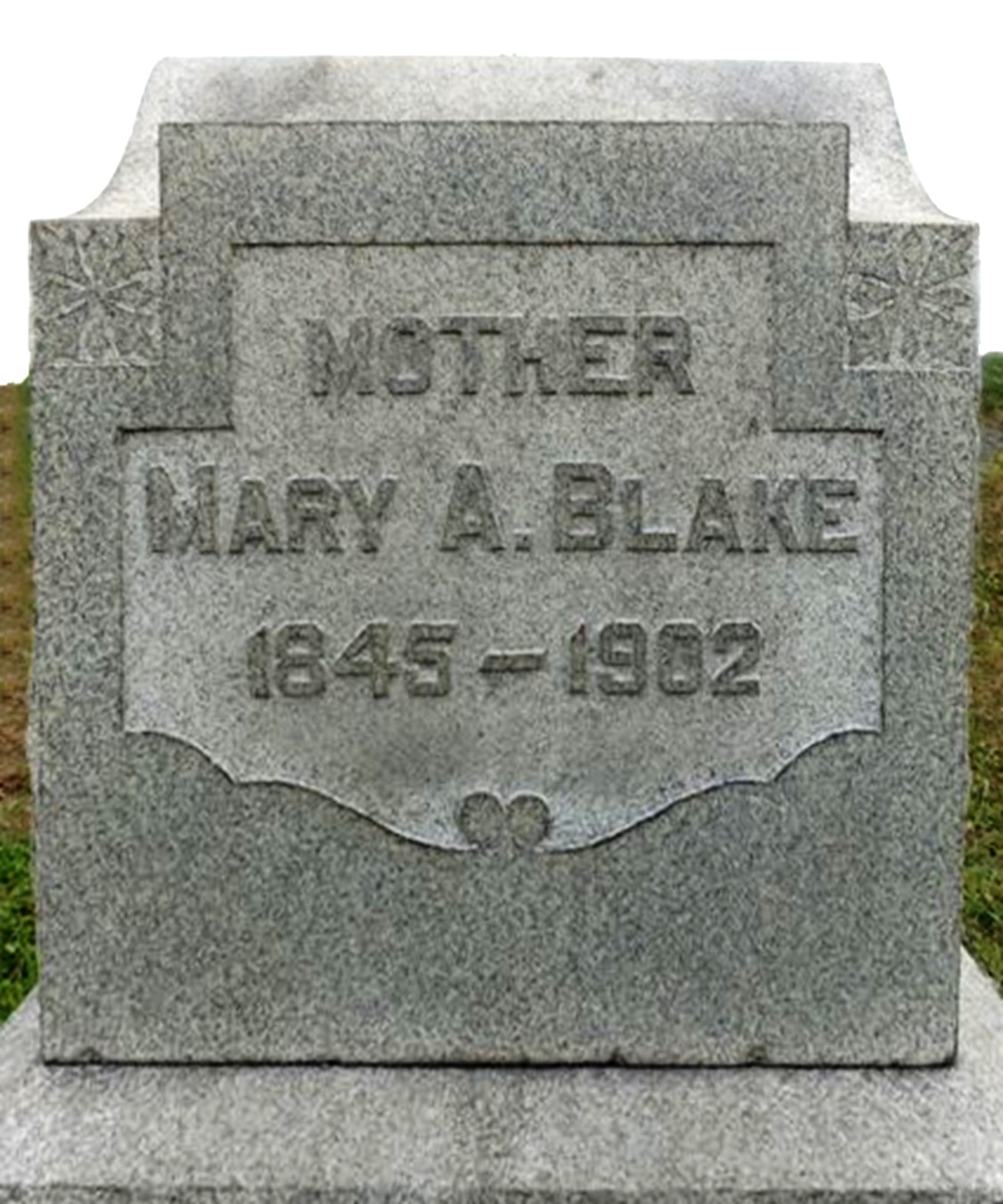 The 1900 U. S. Census taken on June 1, 1900 shows Easten Blake (age 56) born September 1843 in Pennsylvania to Pennsylvania-born parents is an Iron Molder owning his home with a mortgage on First Street, First Ward, Huntingdon Borough, Huntingdon Co., PA. Living with him is his wife of 24 years, Mary A. Blake (age 53) born April 1847 in Pennsylvania to Pennsylvania-born parents. Also living there is his unmarried daughter, Mary E. Moore (age 16) born April 1884 in Pennsylvania to Pennsylvania-born parents.
