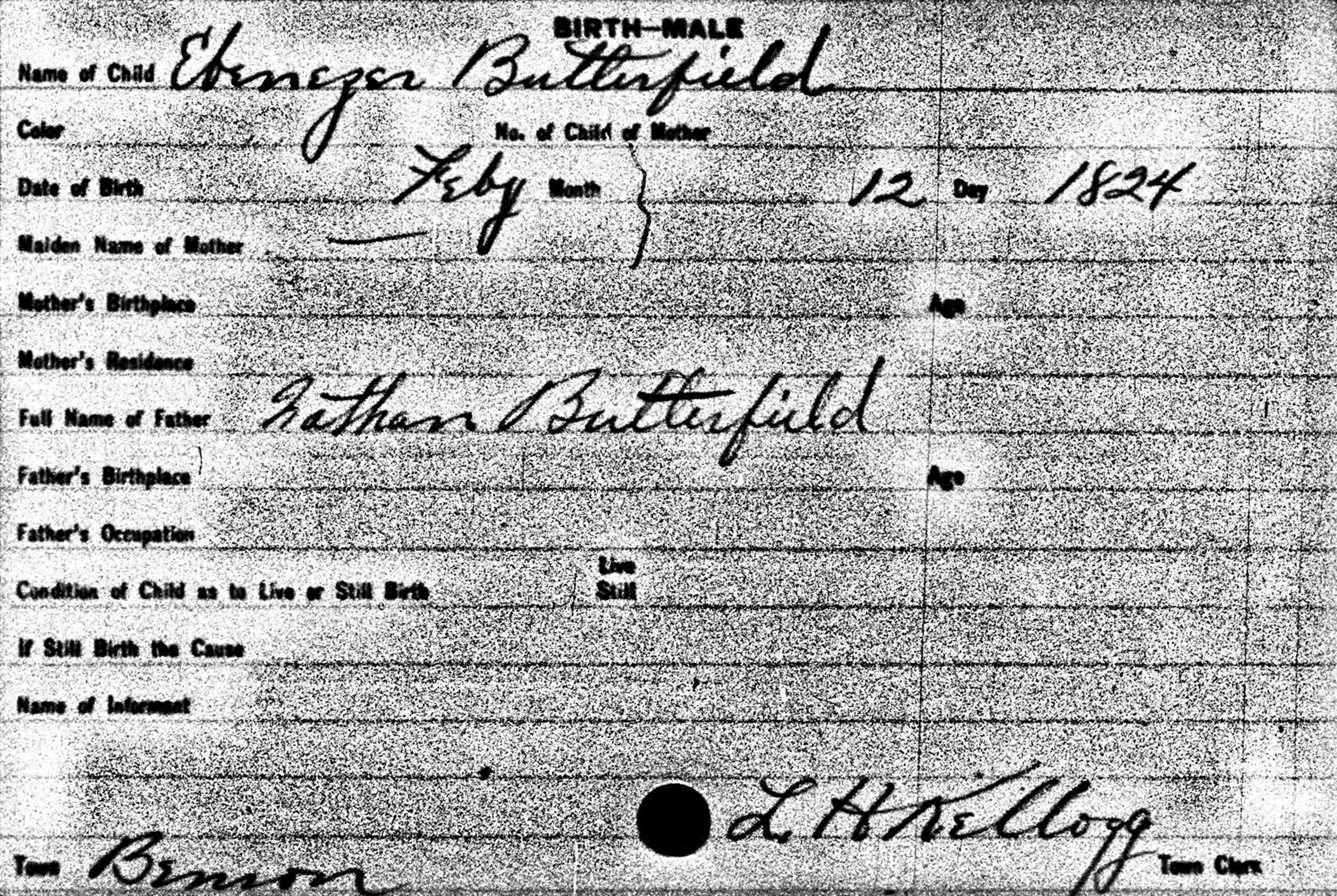 Ebenezer Butterfield was born February 12, 1824, in Benson Twp., Rutland Co., VT.