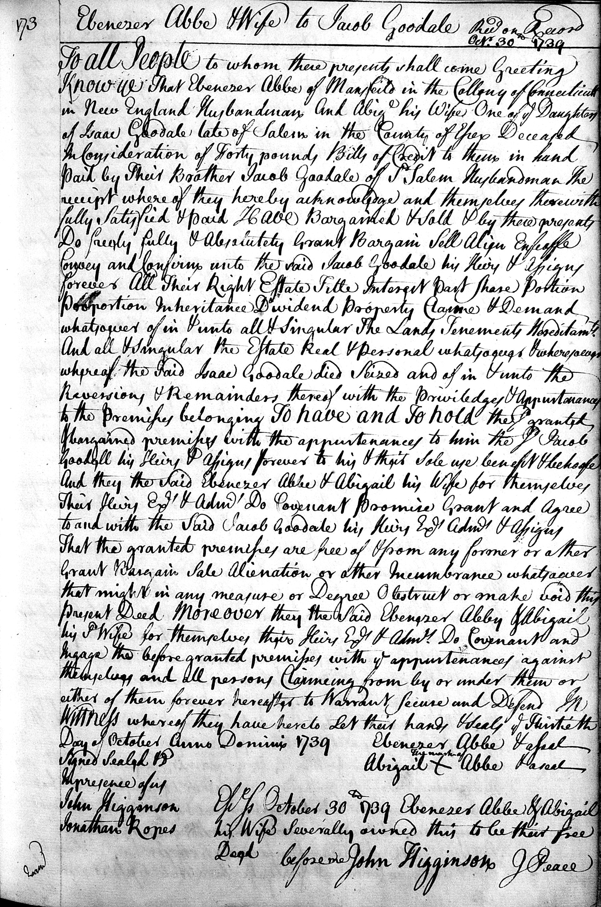 Essex County, Massachusetts, FHL866047; Volume 78; P173; Image 474 of 586. Record of Ebenezer and Abigail Goodale Abbe, daughter of Isaac Goodale, dec'd, land sale to brother Jacob Goodale. https://www.familysearch.org/ark:/61903/3:1:3QSQ-G9ZZ-BC4L?i=473&cc=2106411&cat=209907