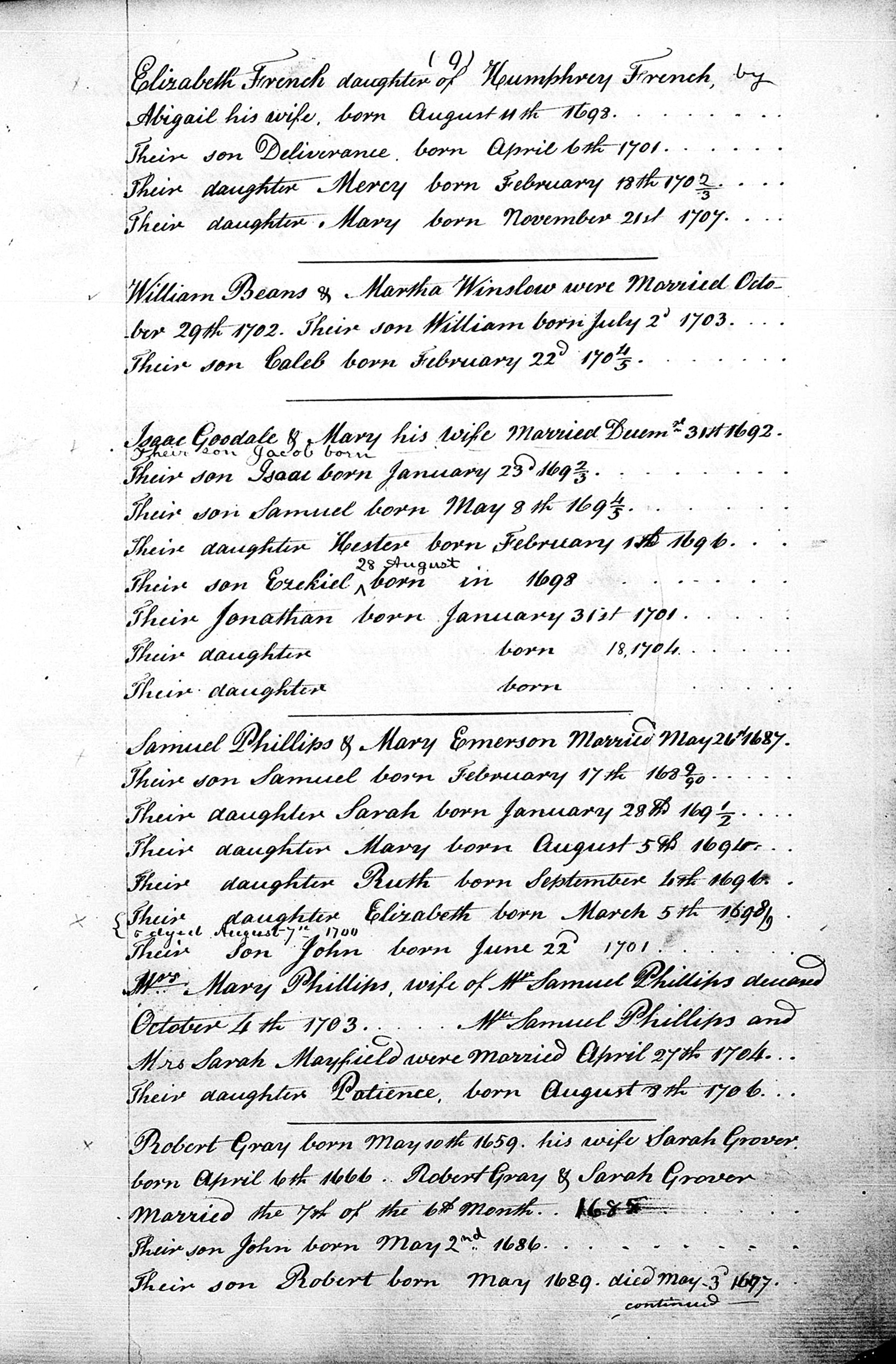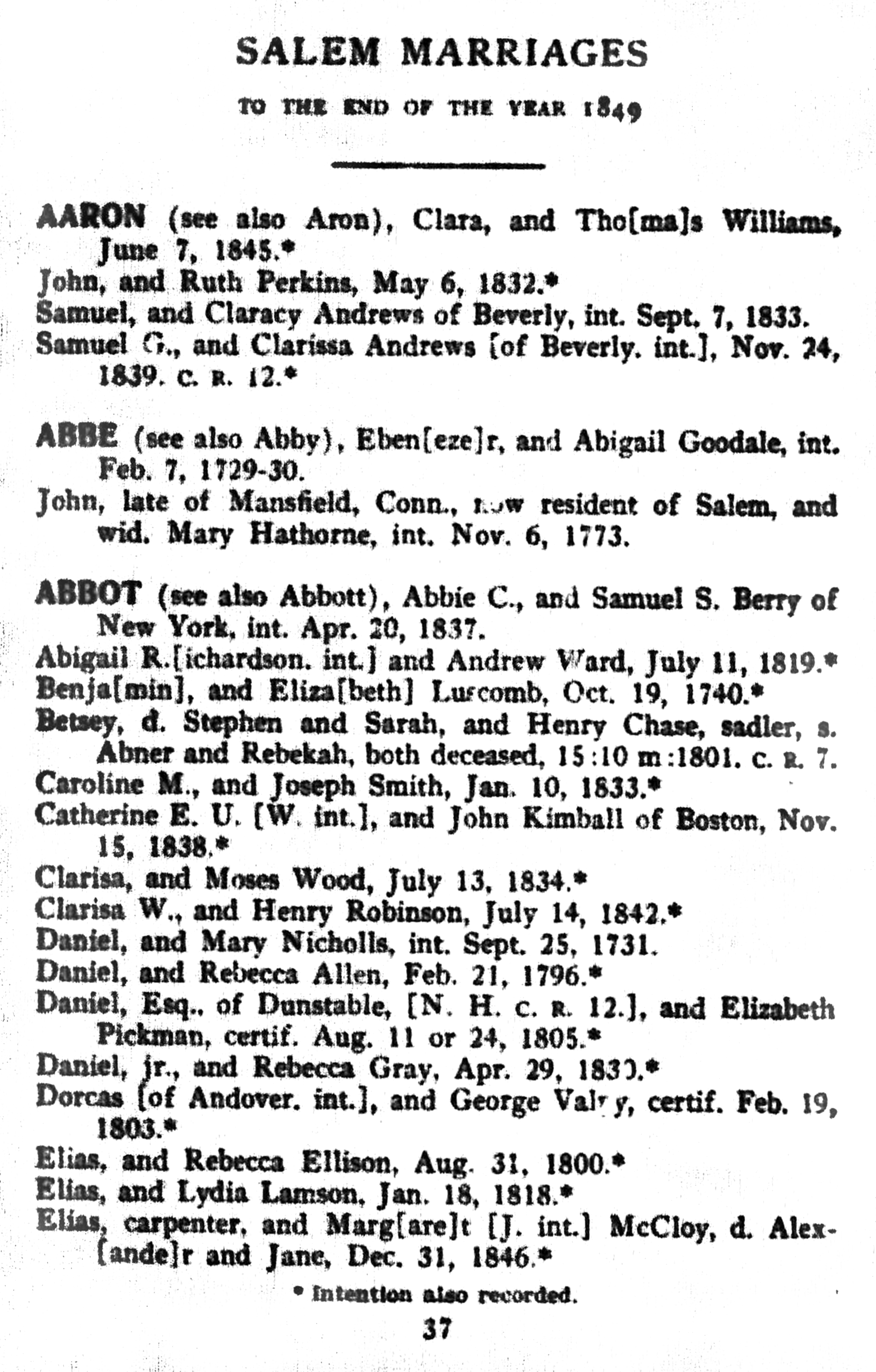 a. Ebenezer Abbe and Abigail Goodale "intended" to get married according to the Salem, Massachusetts record, Feb. 7, 1729/30. https://www.ancestry.com/discoveryui- content/view/29453662:2495. (Source Information: Ancestry.com. Massachusetts, U.S., Town and Vital Records, 1620-1988 [database on-line]. Provo, UT, USA: Ancestry.com Operations, Inc., 2011. Original data: Town and City Clerks of Massachusetts. Massachusetts Vital and Town Records. Provo, UT: Holbrook Research Institute (Jay and Delene Holbrook).)
