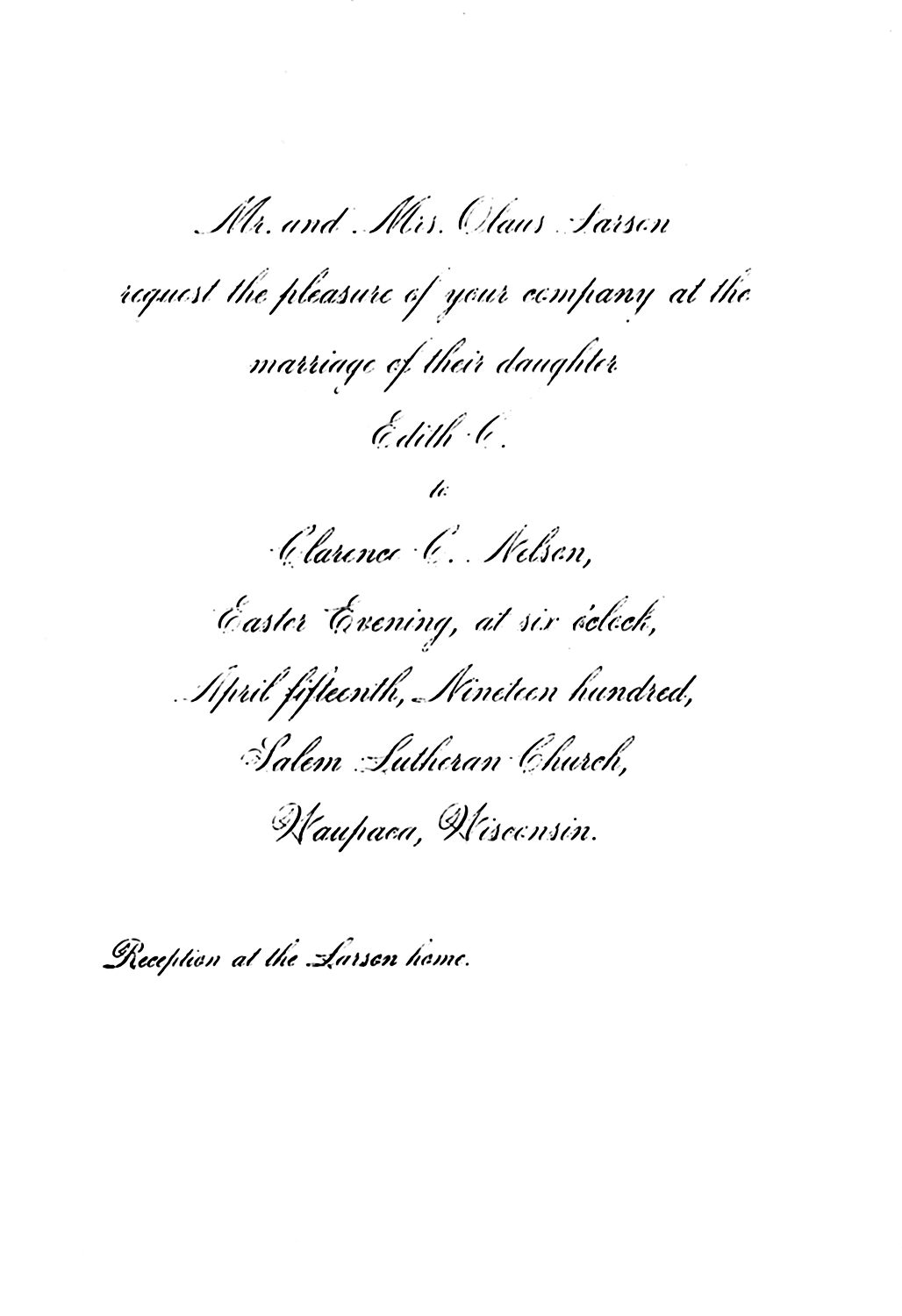 Clarence Cornelius Nelson (age 21), a bachelor, and Edith Christina Larson (age 17), a maiden, were married Easter Sunday, April 15, 1900, at the Salem Lutheran Church, Town of Farmington, Waupaca Co., WI.