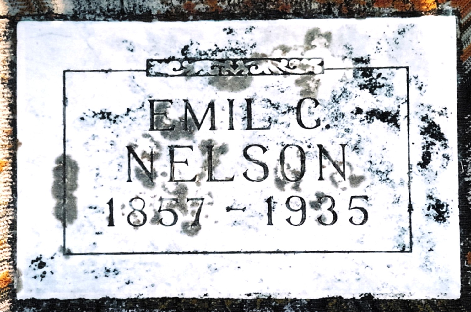 Emil Gustav Nelson died August, 1935, at the Chamberlain Sanitarium, Chamberlain, Brule Co., SD, at age 78. Buried in IOOF Cemetery, Gregory, Gregory Co., SD.