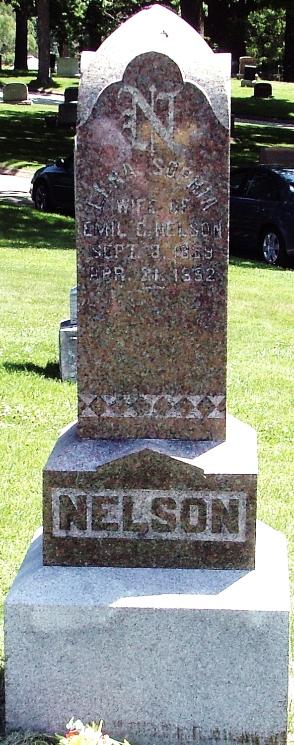 Lena Sophia (Rosander) Nelson died Thursday, April 21, 1892, at the family home, Rockford, Winnebago Co., IL, at age 32. Buried in Scandinavian Cemetery, Rockford, Winnebago Co. IL.