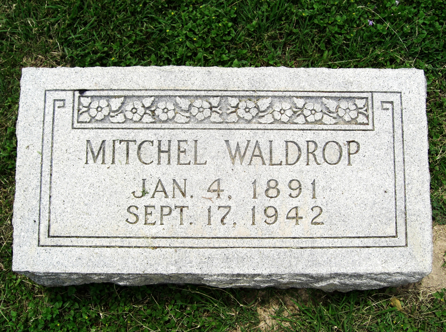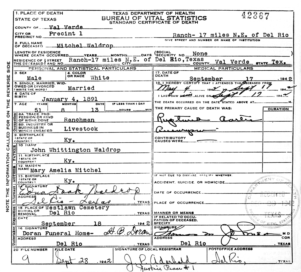 Mitchell Waldrop died September 17, 1942, on his ranch 18 miles east of Del Rio , Val Verde Co., TX, at age 51. Buried in Westlawn Cemetery, Del Rio, Val Verde Co., TX.