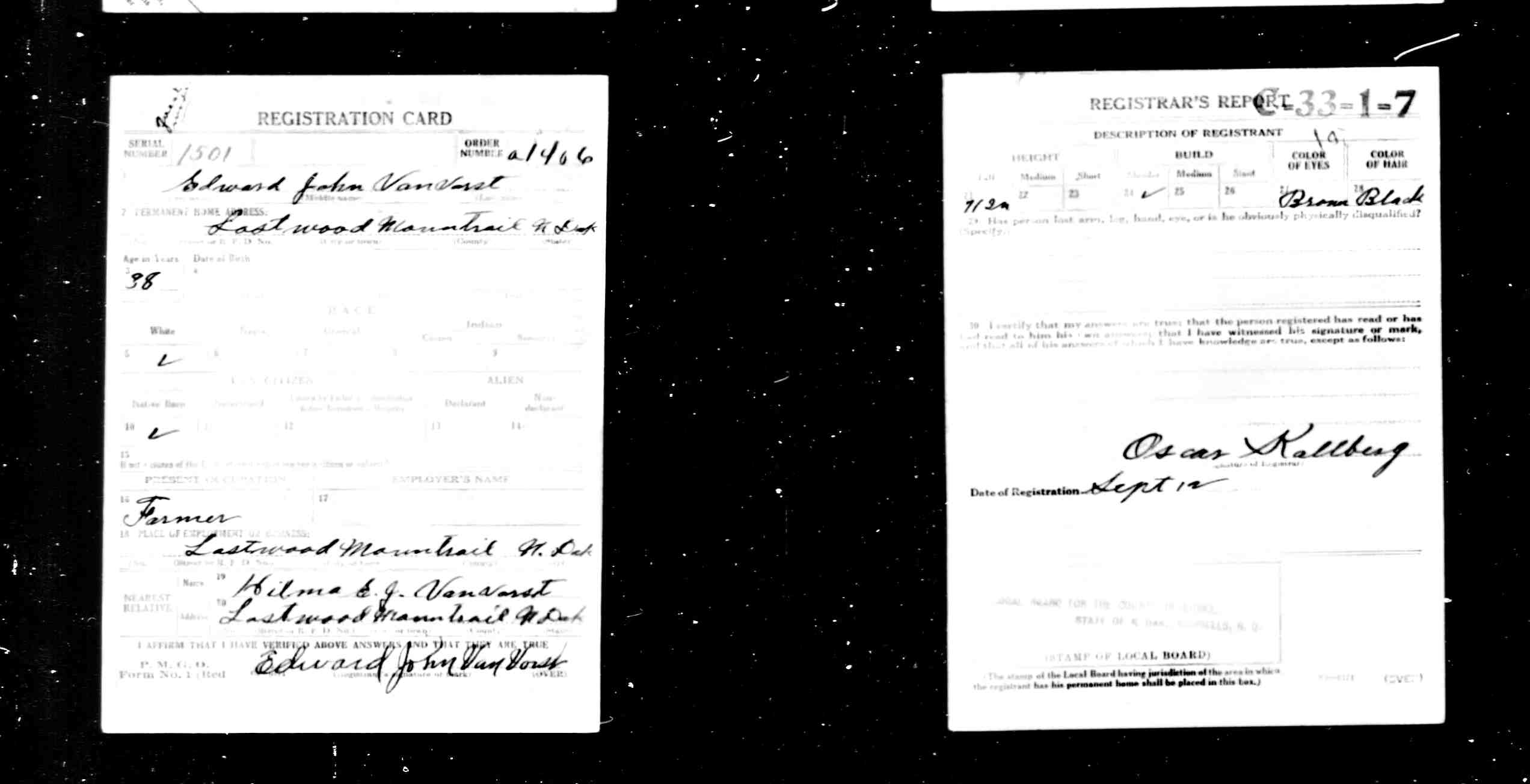 T he 1920 U. S. Census taken on January 15, 1920, shows Edward J. Van Vorst (age 41) born in Minnesota to Minnesota-born parents is a Farmer owning his own farm free of a mortgage and living in Vanville Twp., Burke Co., ND. Living with him is his wife, Helma Van Vorst (age 42) born in Sweden to Swedish-born parents and having emigrated in 1879 and becoming a Naturalized citizen in 1905. Also living there are his three children, all born in North Dakota to Minnesota and Swedish-born parents: Meral M. Van Vorst (age 12); Ruth E. Van Vorst (age 6); and Raymond A. Van Vorst (age 1-6/12). Also living there is Edward's unmarried brother, Burt M. Van Vorst (age 30) born in Minnesota to Minnesota-born parents is a General Farm Laborer.