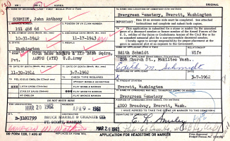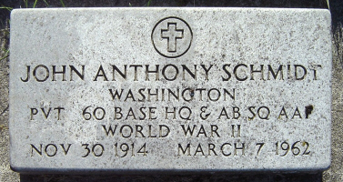John Anthony Schmidt is buried in Evergreen Cemetery, Everett, Snohomish CO., WA. Thanks to Find-A-Grave for making this image available.