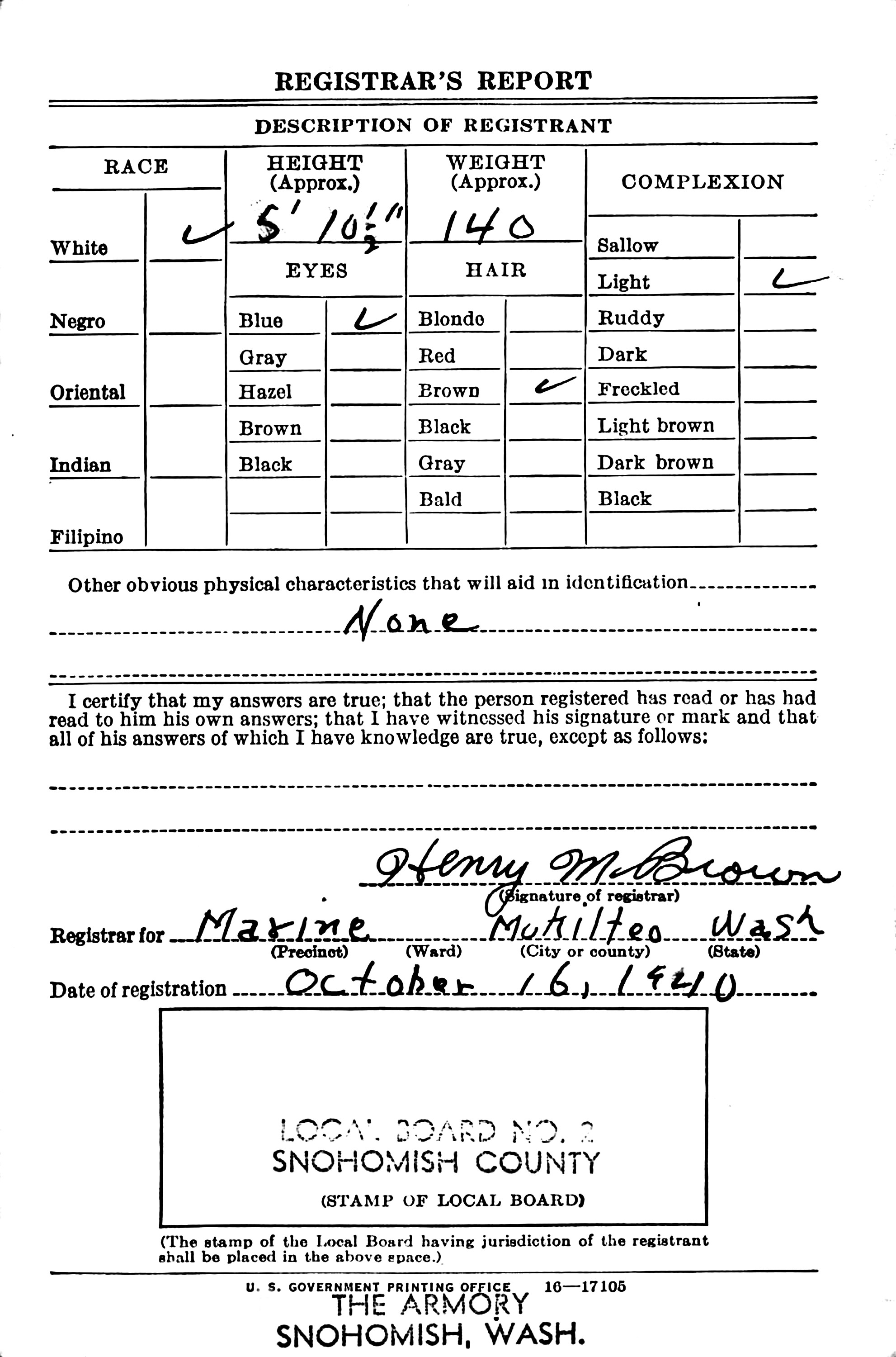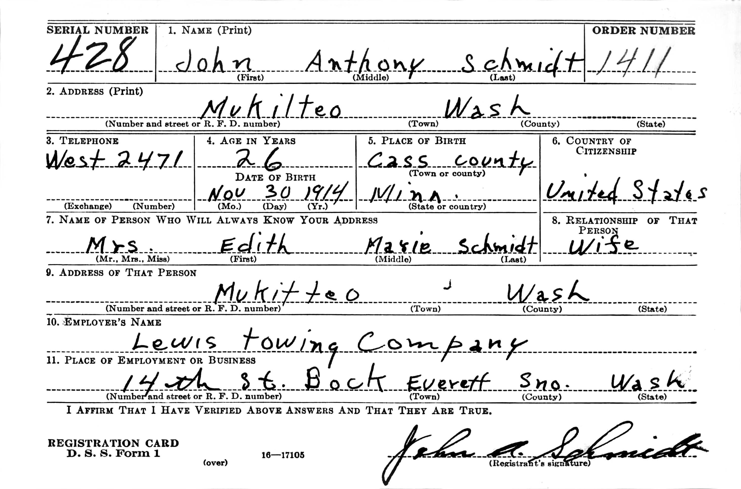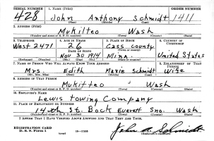 The WWII Draft Registration Report taken on October 16, 1940, shows John Anthony Schmidt (age 26) born November 30, 1914, in Cass Co., MN, works for Lewis Towing Company, and is living in Mukilteo, Snohomish Co., WA. His nearest relative is his wife, Edith Marie Schmidt of the same address.