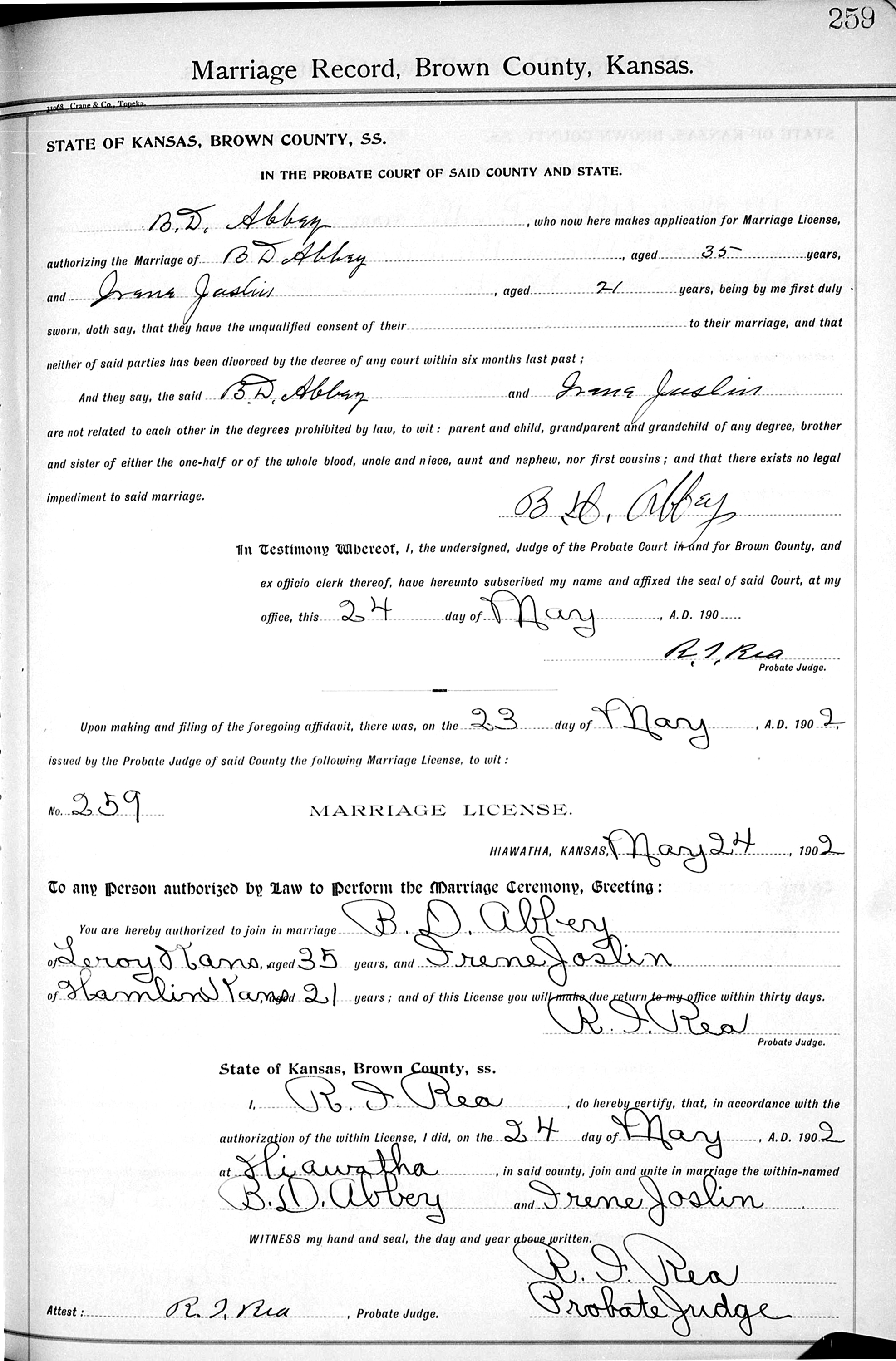 Brainard D. Abbey and Irine Joslin were m arried May 24, 1902, in Hiawatha, Brown Co., KS.