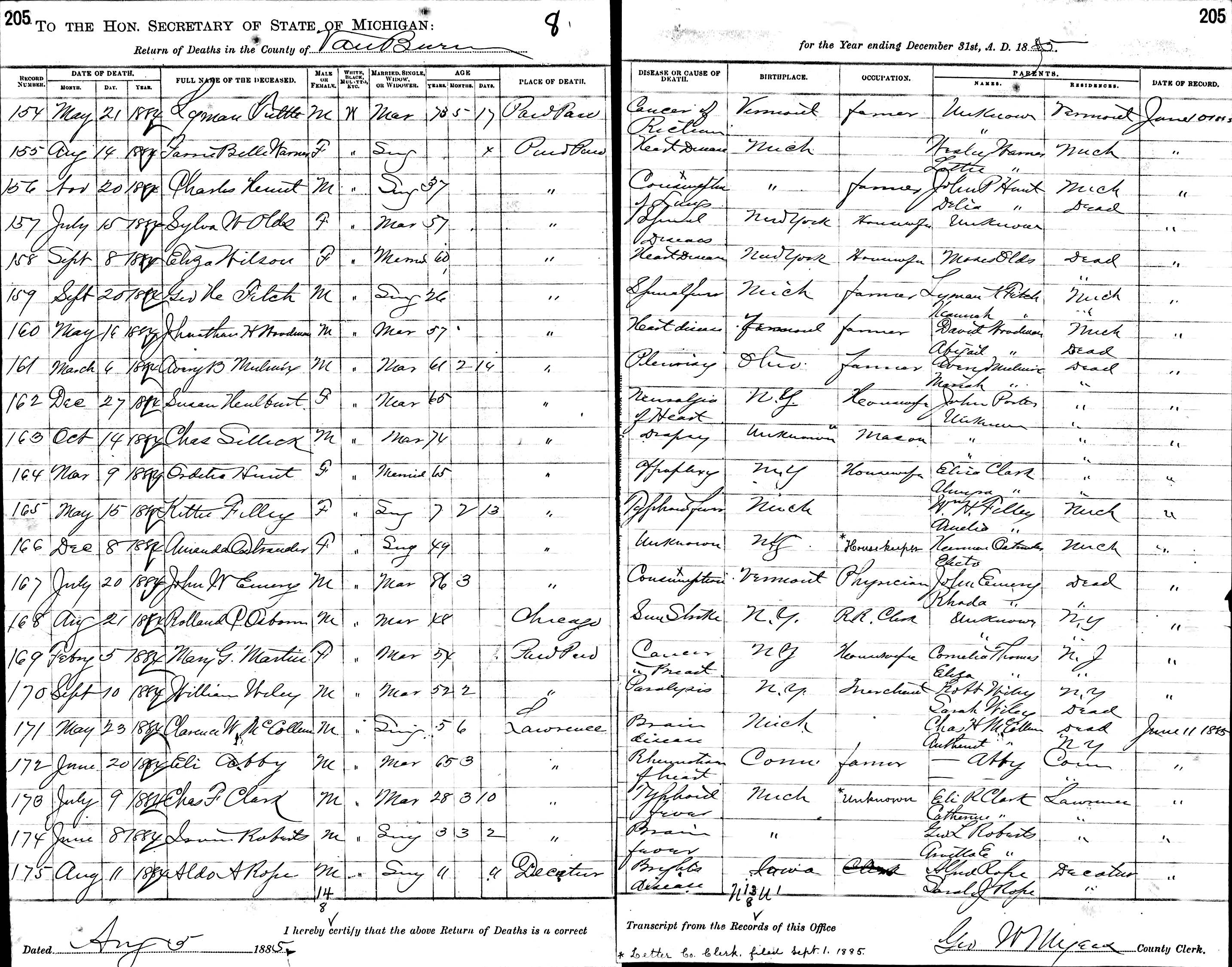Eli Abby died June 20, 1884, in Lawrence, Van Buren Co., MI, at age 64 years, 2 months, and 8 days. Buried in Hill Cemetery, Lawrence, Van Buren Co., MI. Cause of Death is listed as Rheumatism of Heart.