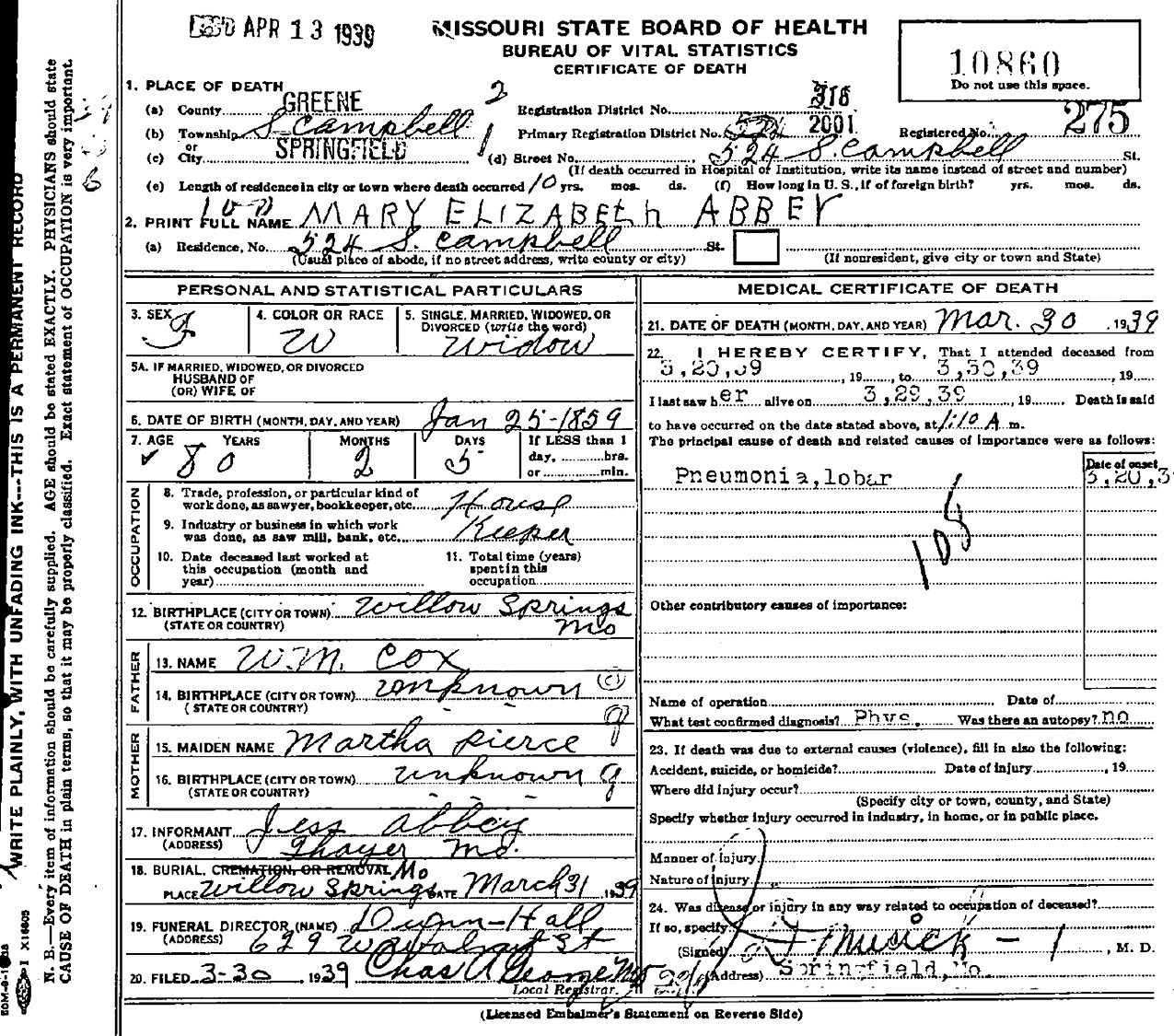 Mary Elizabeth Cox died March 30, 1939, in Springfield, Campbell Twp., Greene Co., MO (age 80). Buried in Willow Springs City Cemetery, Willow Springs, Howell Co., MO.