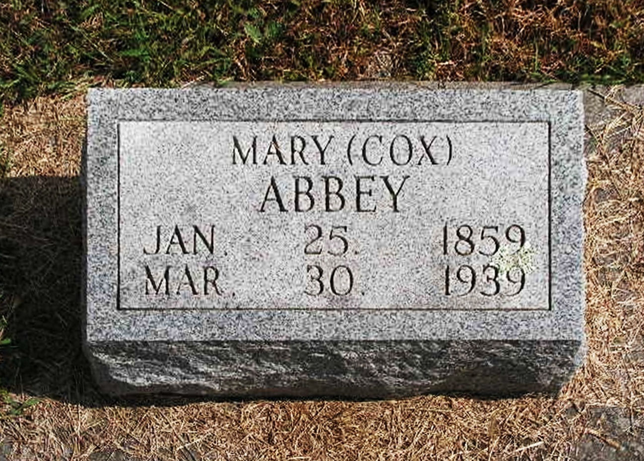 Mary Elizabeth (Cox) Abbey is b uried in Willow Springs City Cemetery, Willow Springs, Howell Co., MO. Thanks to Find-A-Grave for making this image available.