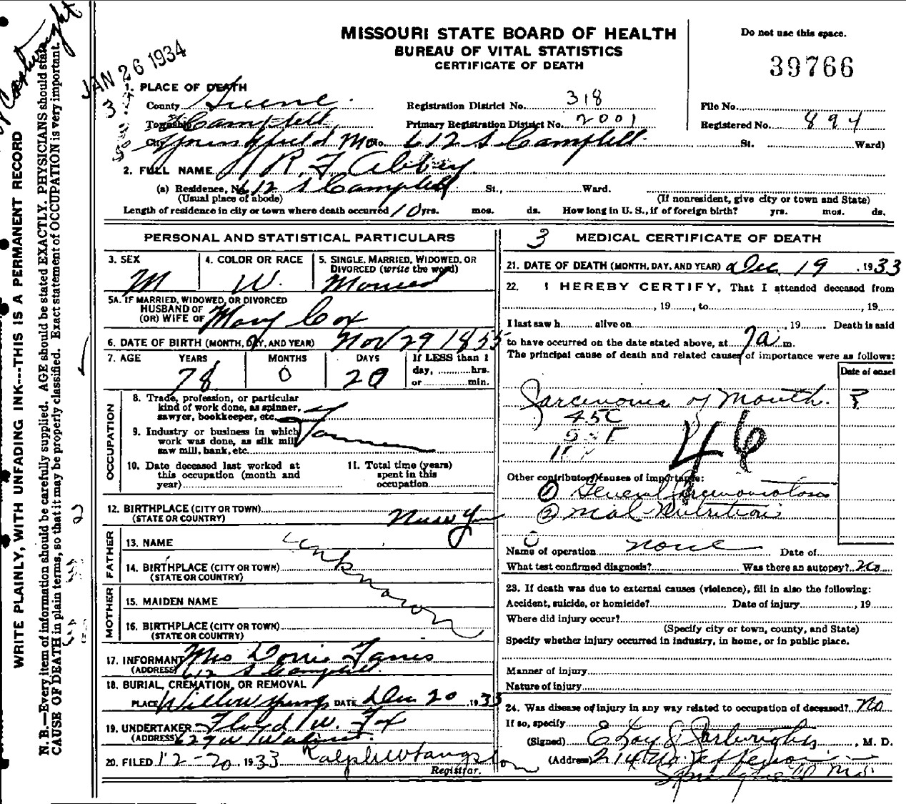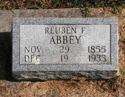 Reuben Ferguson Abbey died December 19, 1933, in Springfield, Campbell Twp., Greene Co., MO, at age 78. Buried in Willow Springs City Cemetery, Willow Springs, Howell Co., MO.