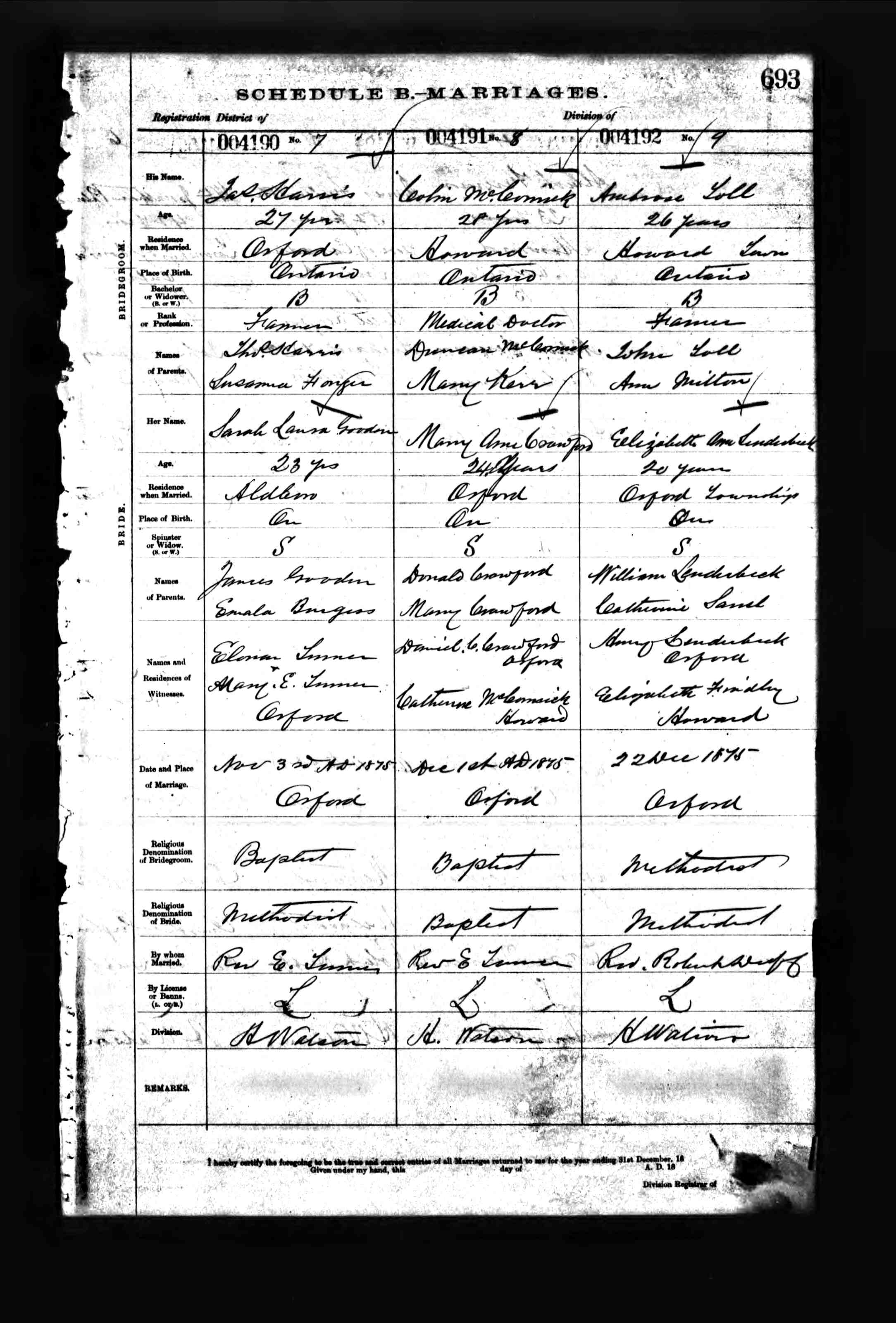 Ambrose Wilson "Ambrow" Toll and Elizabeth Ann "Annie" Lenderbeck were married December 22, 1875, in Orford Twp., Kent Co., Ontario, Canada. Ambrose Toll (age 26) Farmer, Ontario, Howard Twp., s/o John Toll and Ann Milton and Elizabeth Ann Lenderbeck (age 20) Ontario, Orford Twp., d/o William Lenderbeck and Catherine Sanel were married December 22, 1875 in Orford, Kent Co., Ontario, Canada. Witnesses were Henry Lenderbeck and Elizabeth Findley of Howard.