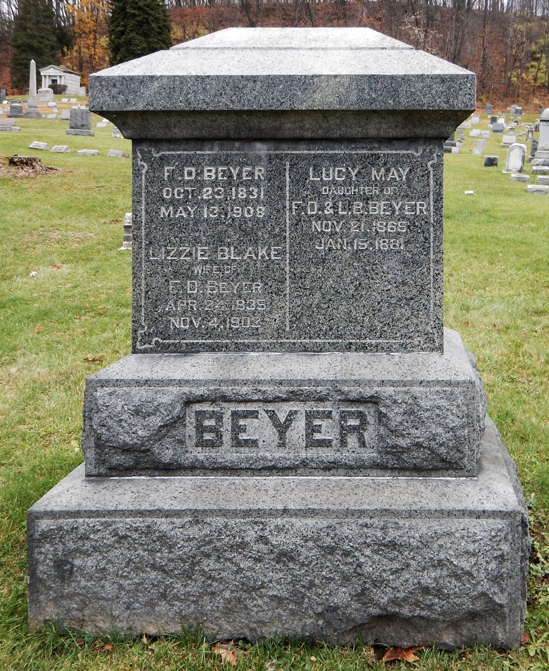 Francis David Beyer and Elizabeth B. "Lizzie" (Blake) Beyer are buried in Grandview Cemetery, Tyrone, Blair Co., PA. Thanks to Find-A-Grave for making this image available.