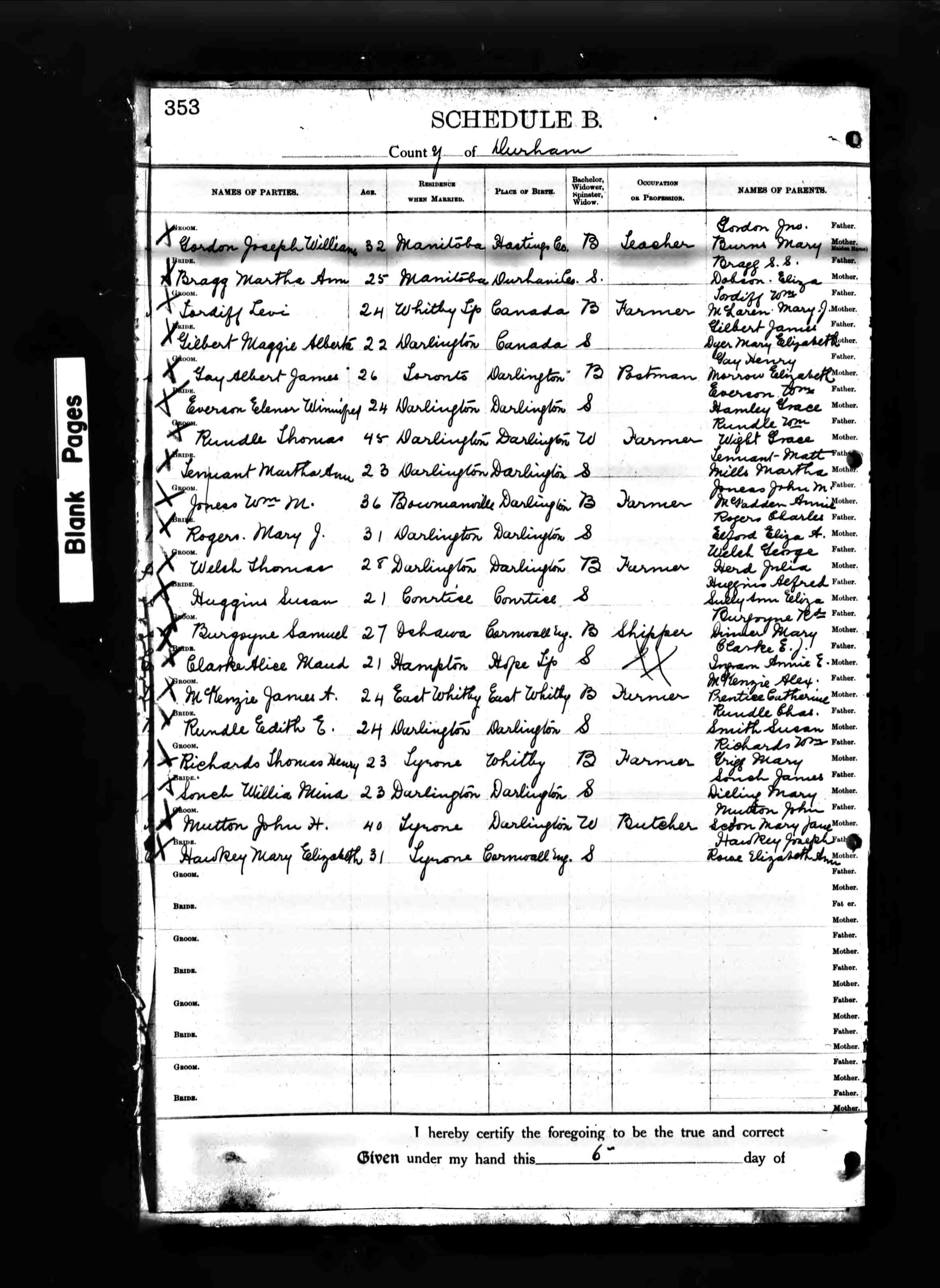 Joseph William Gordon and Martha Ann Bragg were married August 12, 1901, in Darlington, Ontario, Canada.